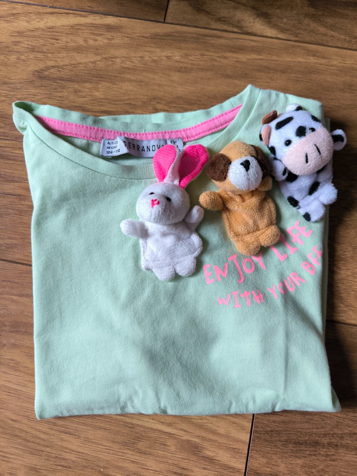 Krásne tričko nosené veľmi pekný stav ,zvieratká su tam nasite,veľkosť písaná 110 no nosili sme v 104