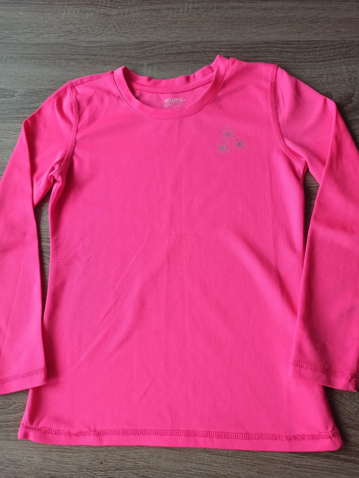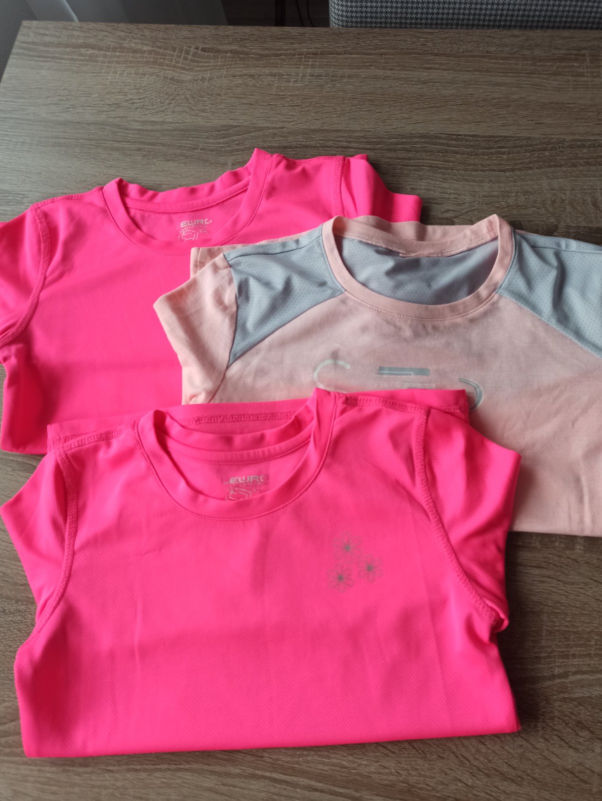 Svietiace ružové 2ks Zn. Lewro č. 134. Celková dĺžka 52cm, rukáv od krku 54cm, spodný rukáv dĺžka 37cm, šírka 2x37cm. Sem tam zatrhnute, na rukáve malý fliačik. Lososové Zn. Domyos Decatloh č.134, celková dĺžka 50cm, zadný diel dĺžka 51cm, rukáv od krku 58cm, spodný rukáv dĺžka 39cm, šírka 2x38cm. Cena za všetky spolu.