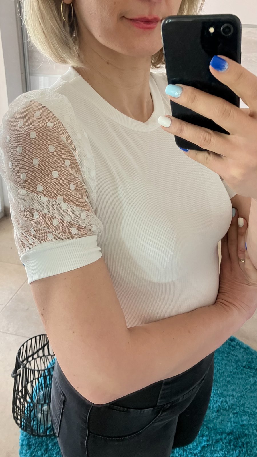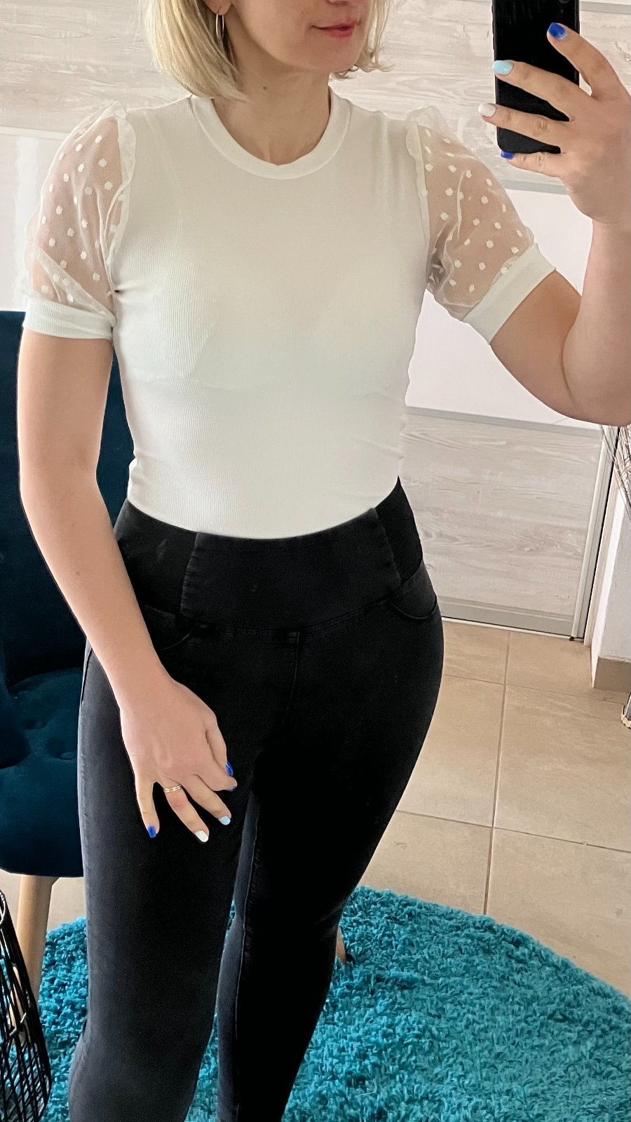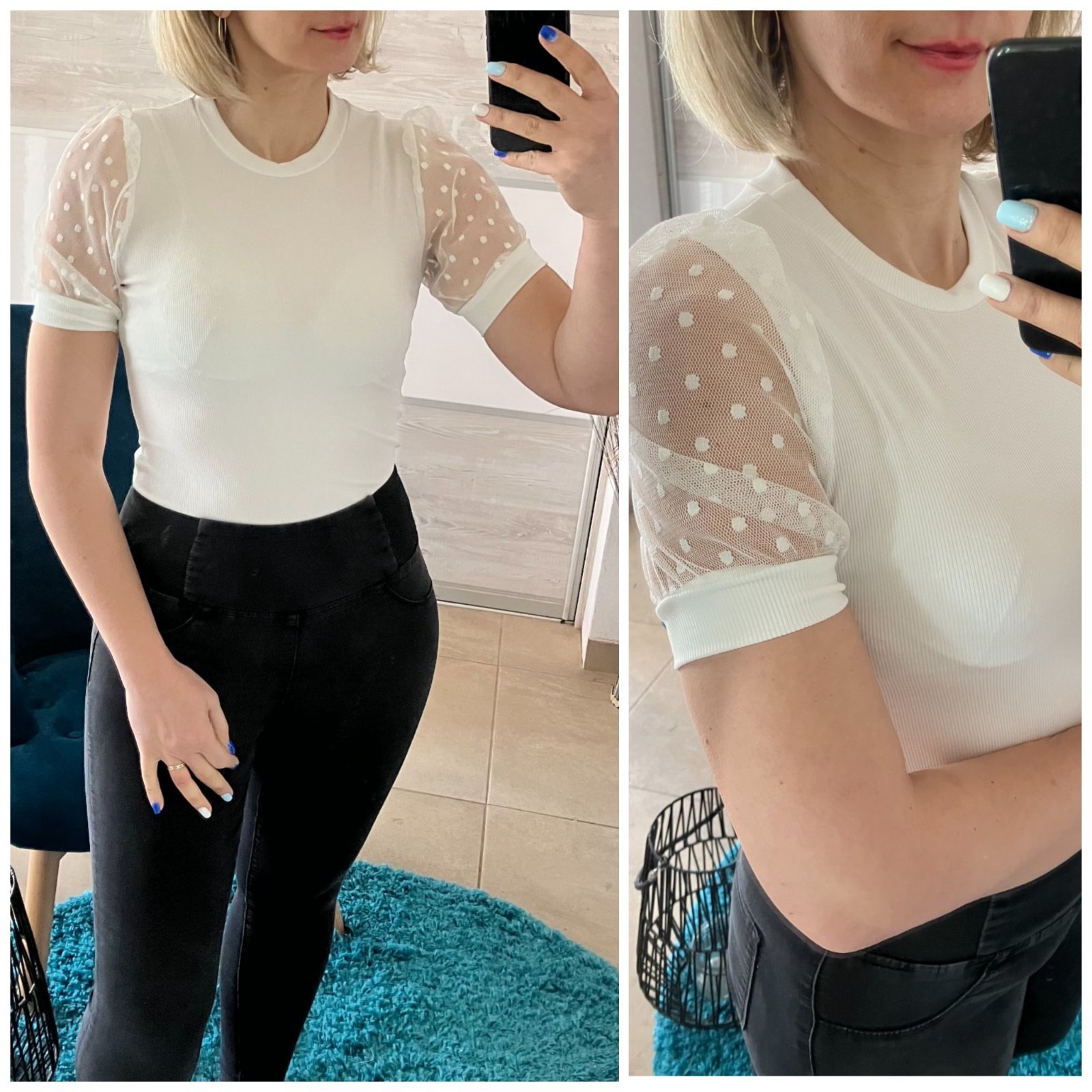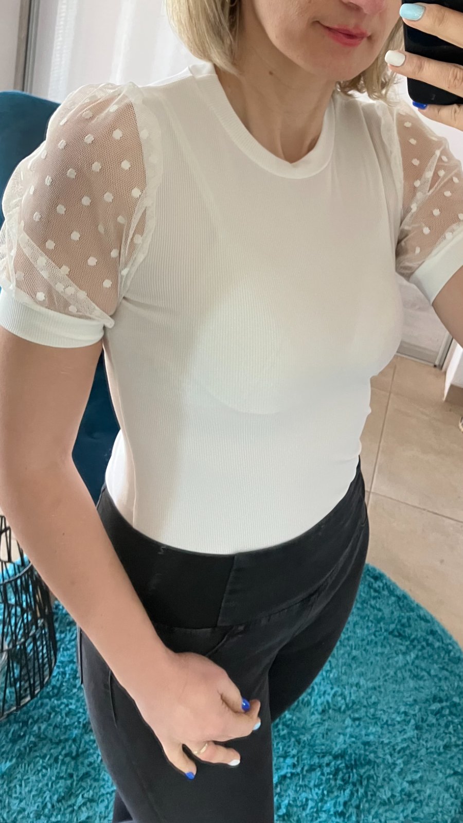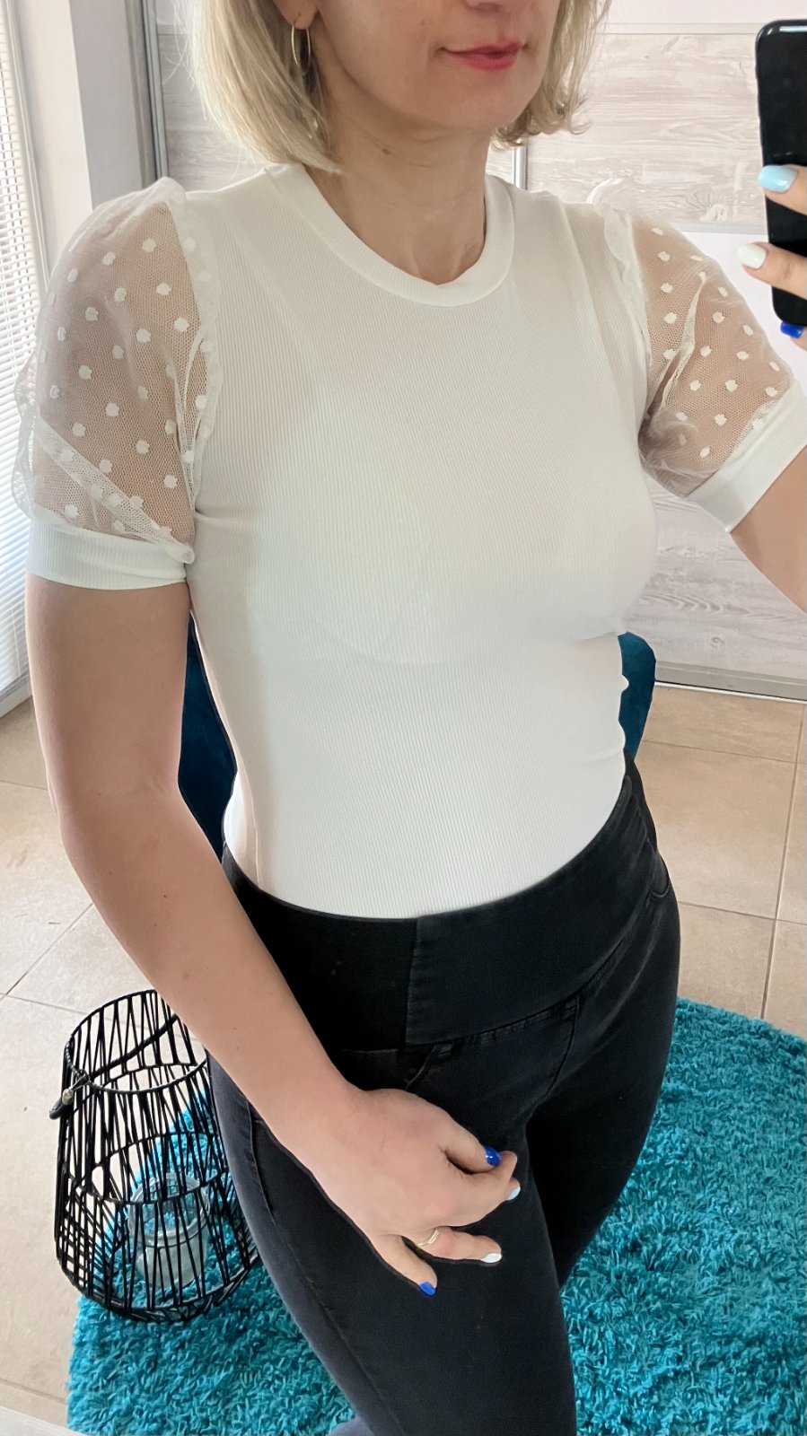 Dámske biele tenké rebrované tričko s tylovým bodkovaným rukávom, vhodné na bežné nosenie ale kľudne ja na rôzne príležitosti. Top priliehavého strihu s orkúhlym výstrihom. Elastické. Materiál:93%polyester 7%elastan. Veľkosť UNI (vhodná pre S,M,L). Krajina pôvodu: Taliansko.