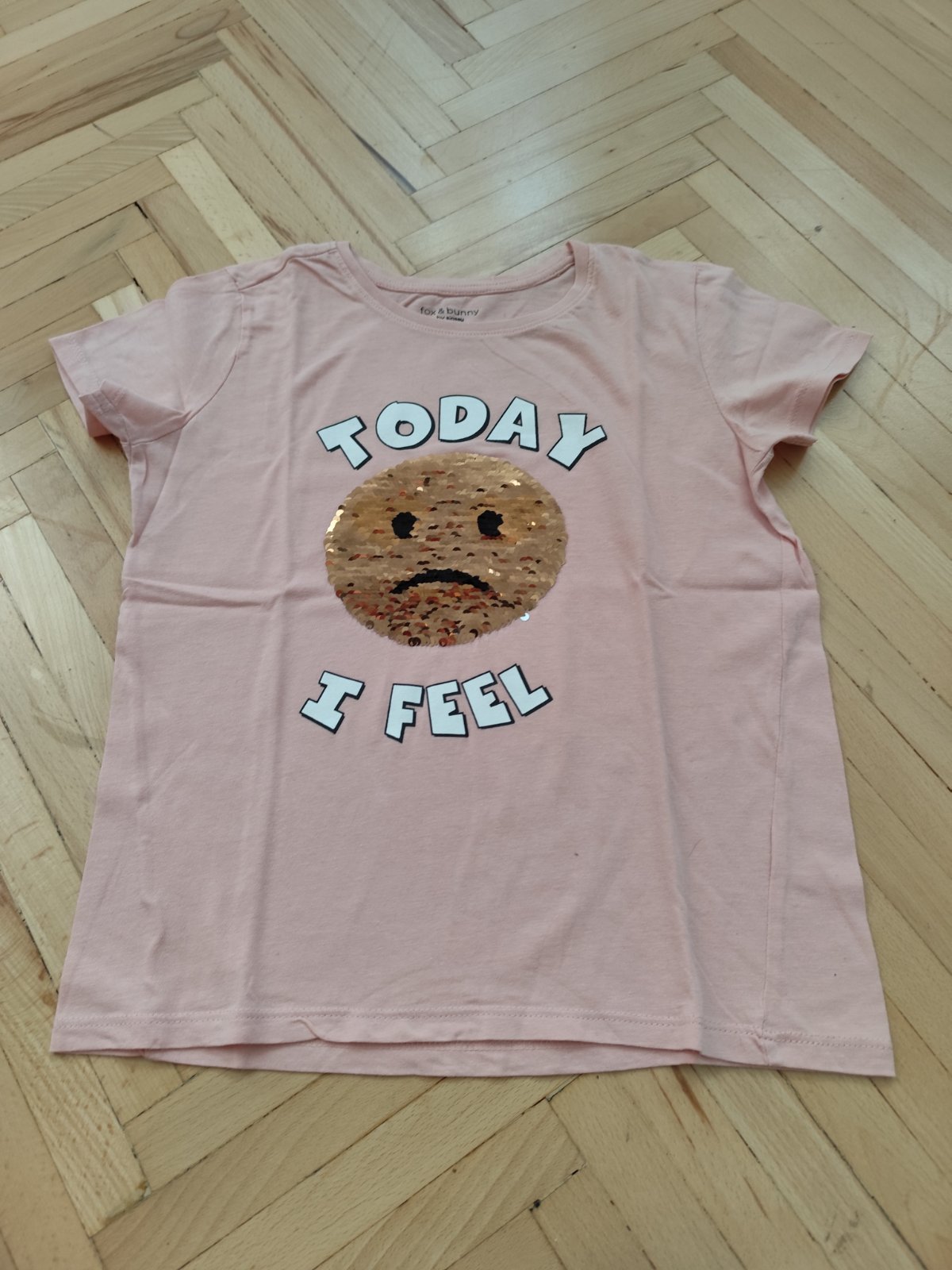 Krásne tričko s flitrovým smajlíkom, ktorý sa dá meniť podľa nálady. Po jednom dieťatku, bez poškodení.