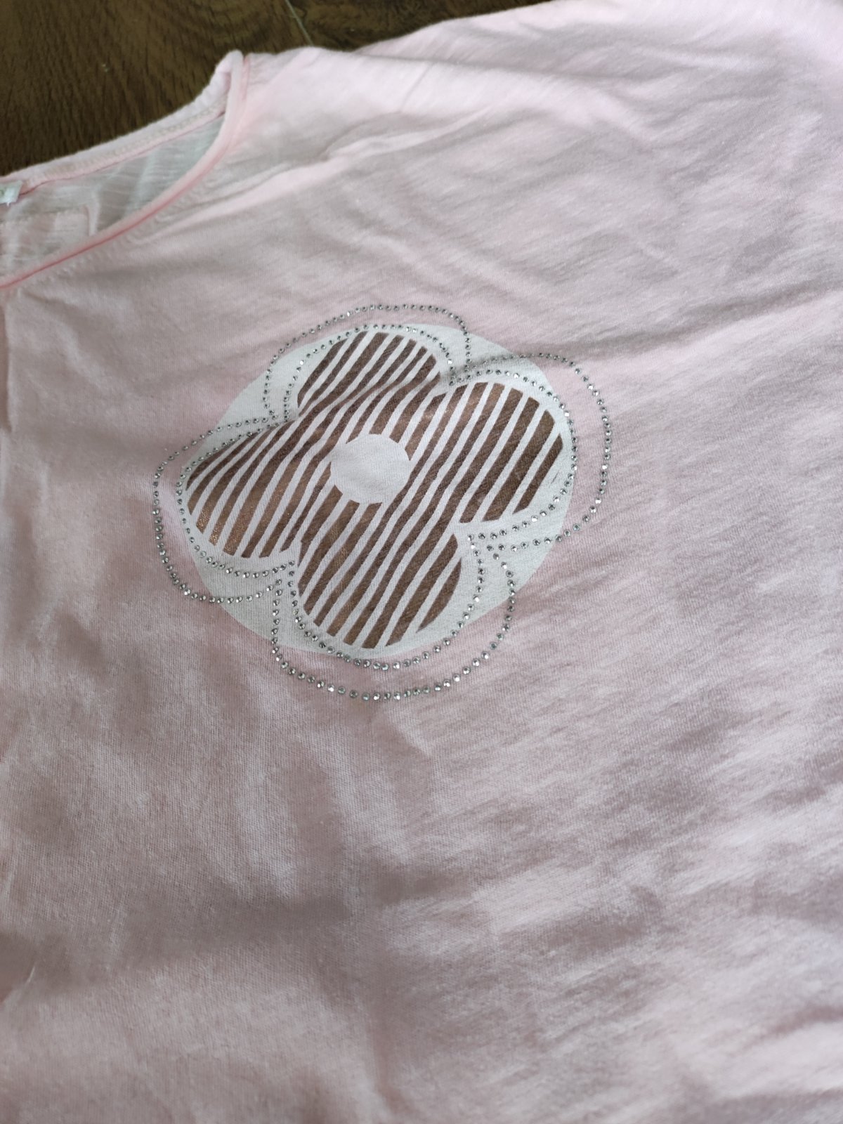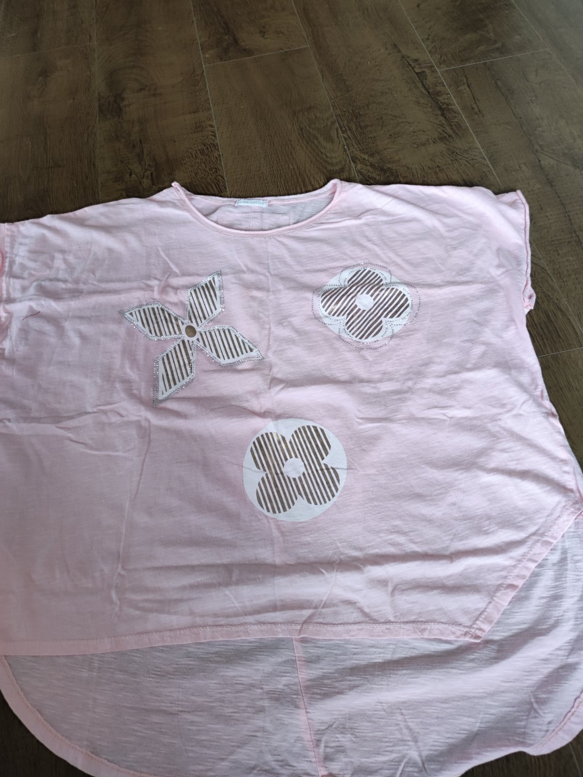 Krásne nové ľahučké bledoružové tričko "s motýlimi krídlami " so zaujímavou aplikáciou (netreba už žiadny náhrdelník) spodná časť trička je elastická - veľkosť odhadujem S - L