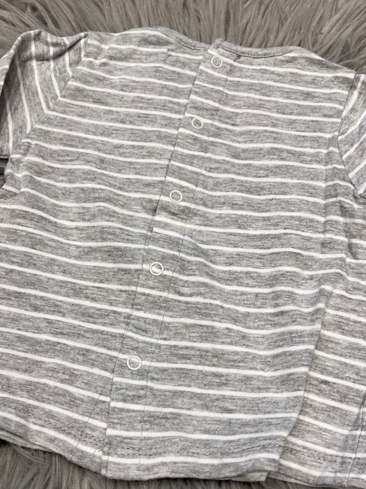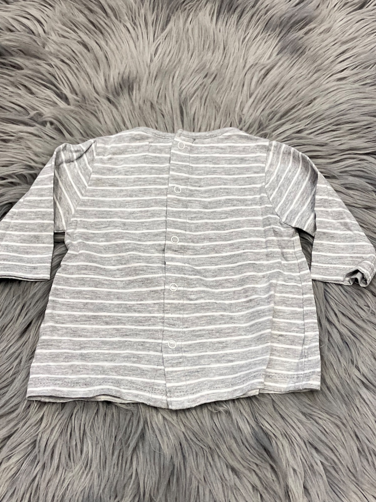 Dievčenské tričko s dlhým rukávom, zapínanie vzadu na cvoky, elastické, pásikavé, sivo-biele.