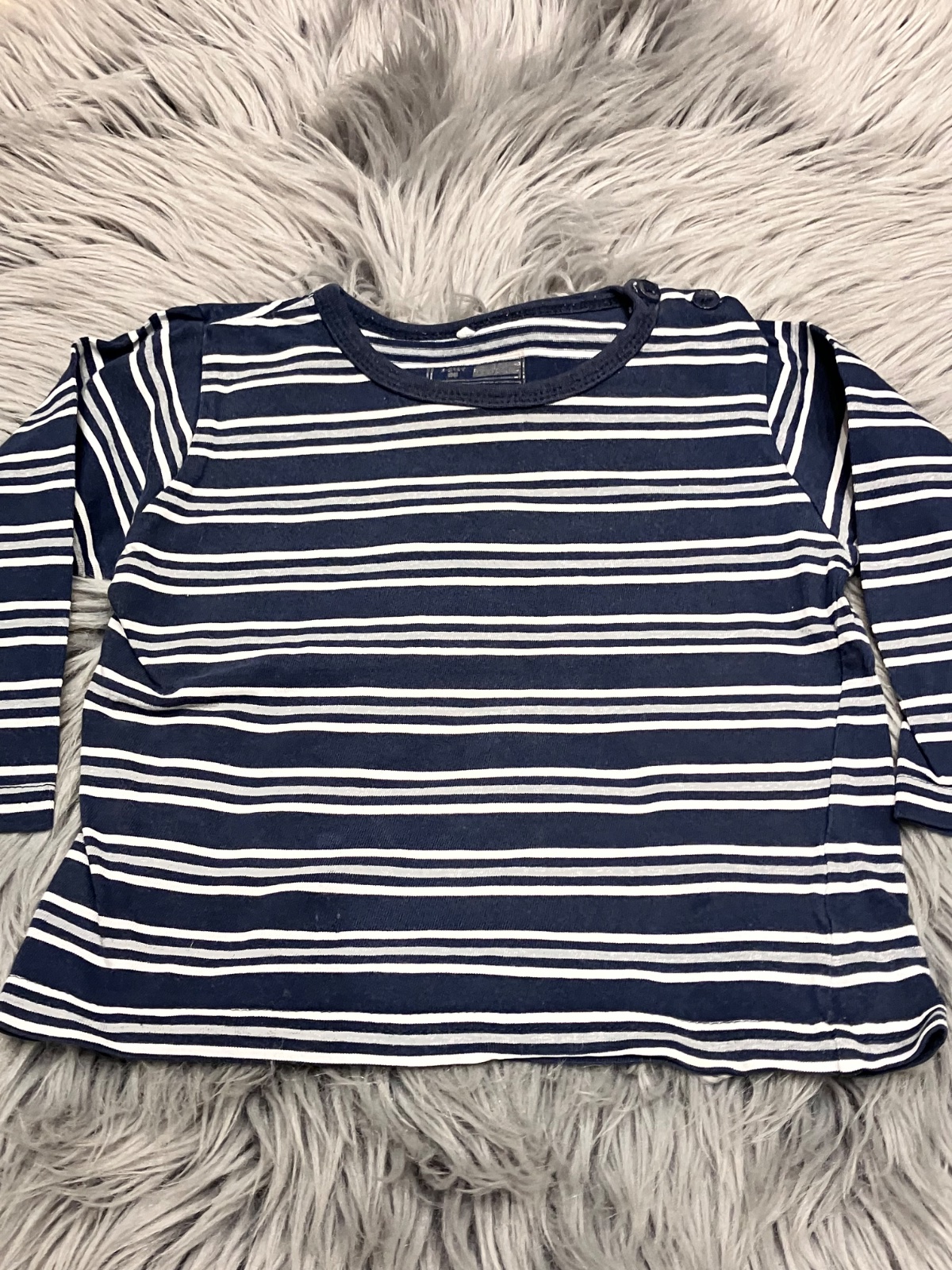 Chlapčenské tričko s dlhým rukávom, pásikavé, zapínanie na ramene na dve gombíky, elastické, veľkosť cca 80. Farba: tmavomodro-sivo-biela.