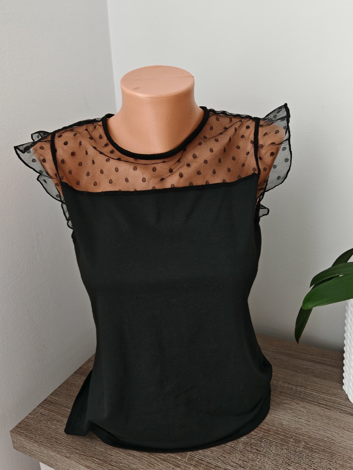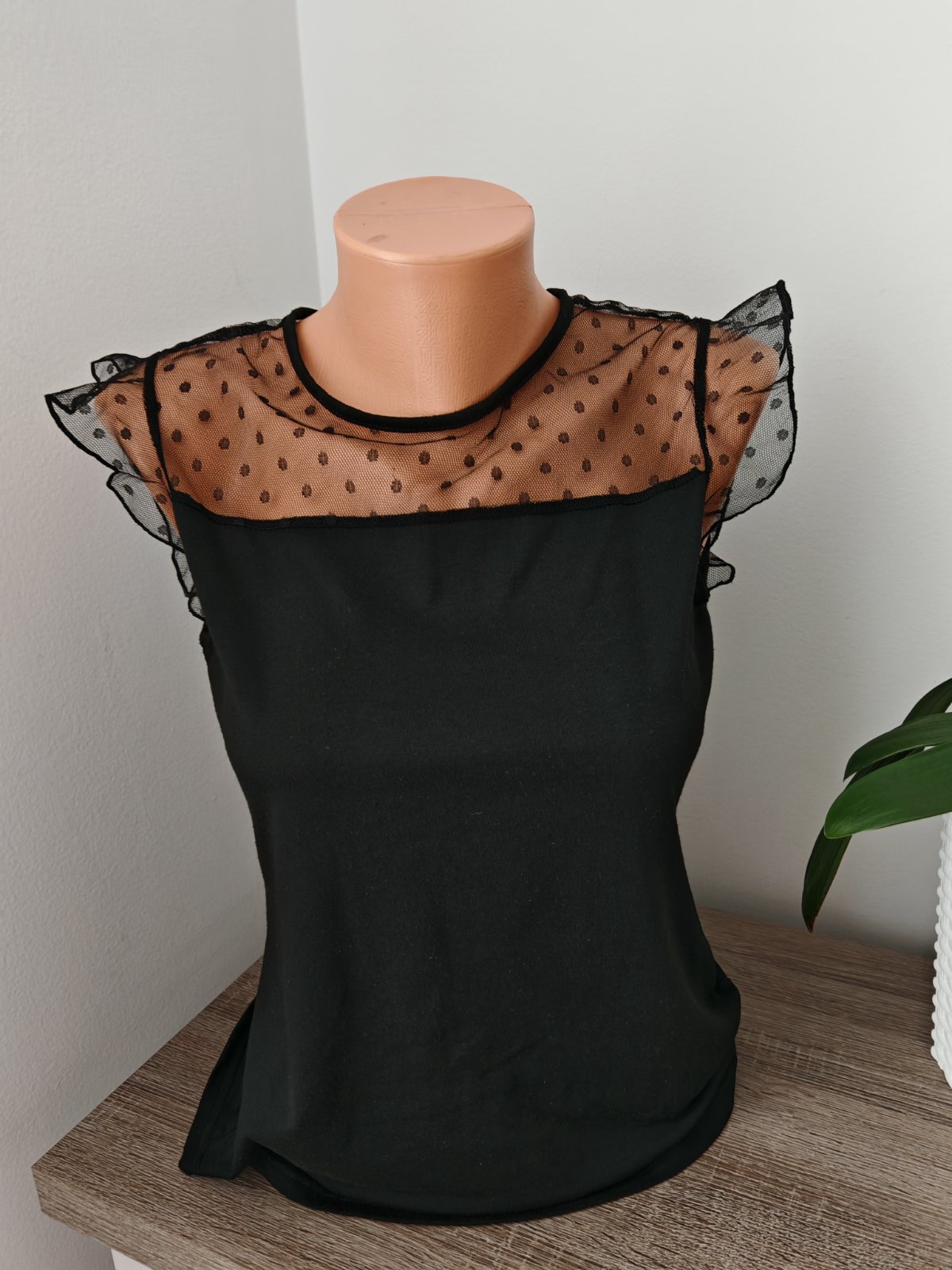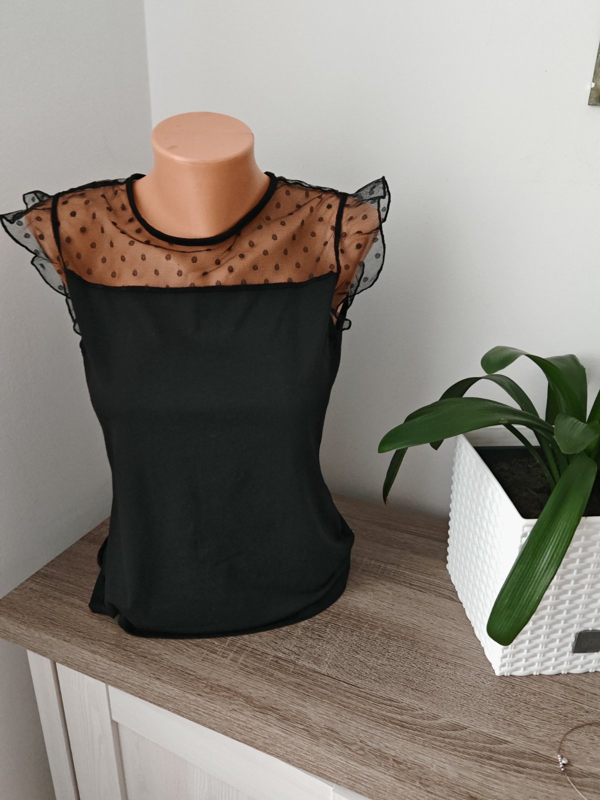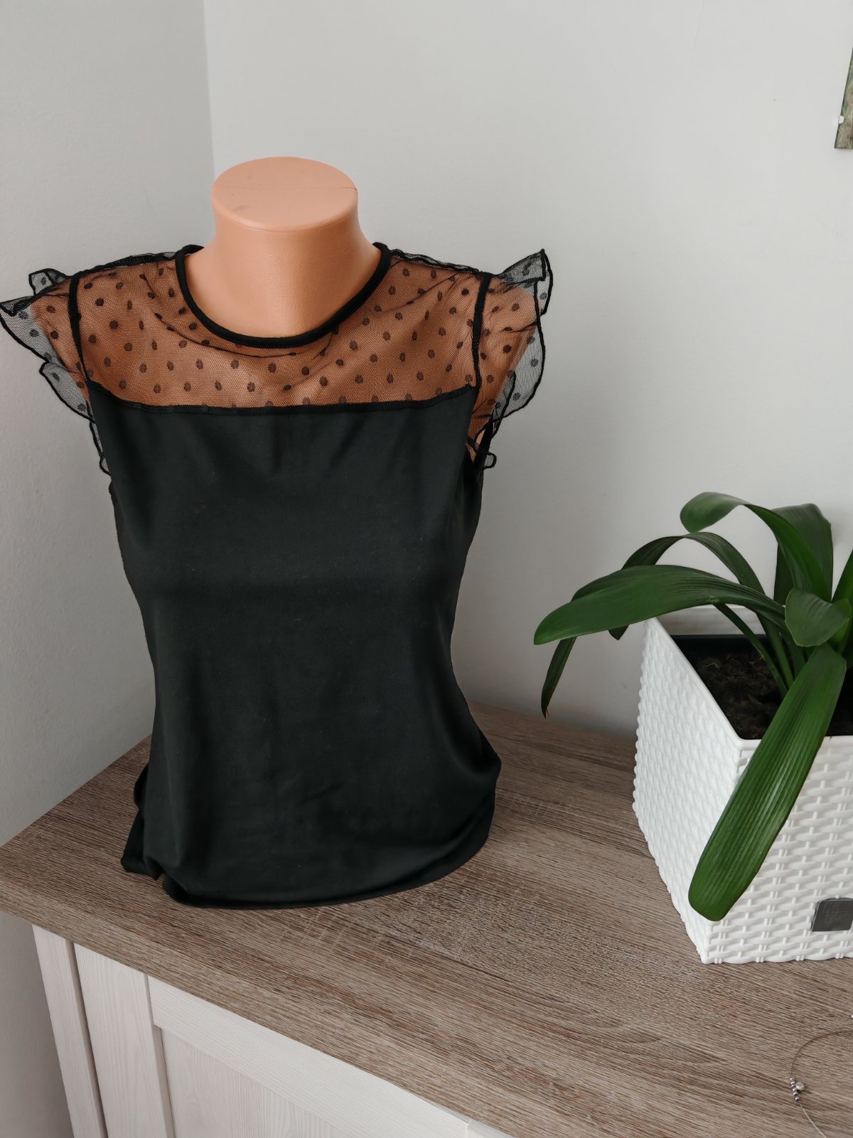 Nadherne cierne body - top s kratkym rukavikom s vyraznou aplikaciou ceresniciek ,spodna cast s nasitym cvockovym zapinanim.Material elasticky polyester. Dokladam real foto!!! Velkost M,sedi na S...