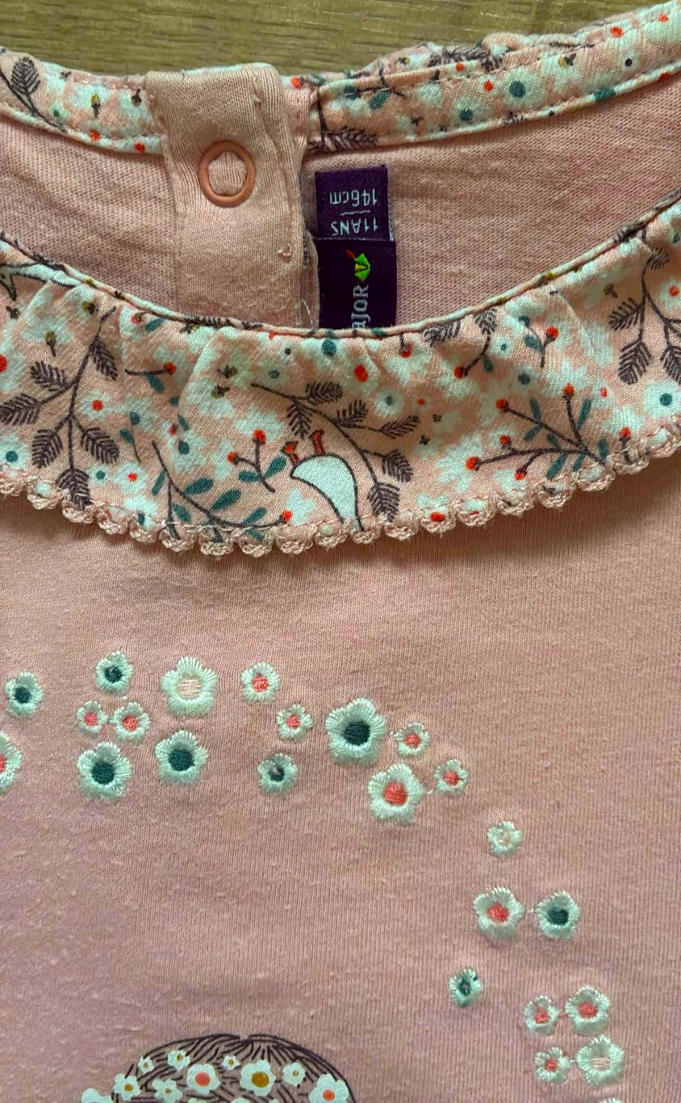 Predám dievčenské tričko s dlhým rukávom, veĺ.146, zn.Sergent Major, má jemnú staroružovú farbu, kvetovaný ozdobný golier, potlač dievčatka s husou a ovečkou s kombináciou vyšívania, d= 50cm, š=40cm, r=51cm, materiál 100% bavlna, bez žmolkov, na lakti 1 mm neviditeĺný fliačik, vhodné do školy aj na voĺný čas, zachovalé.