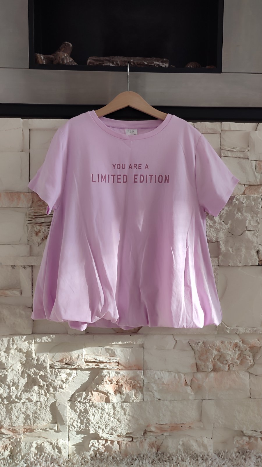 Ponukam ružove tricko s napisom, balónového strihu. Veľkosť písaná 152, podľa mňa nositeľné už skôr.