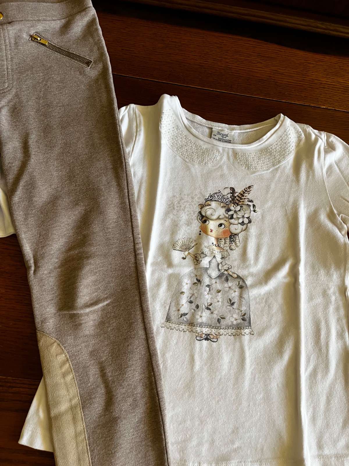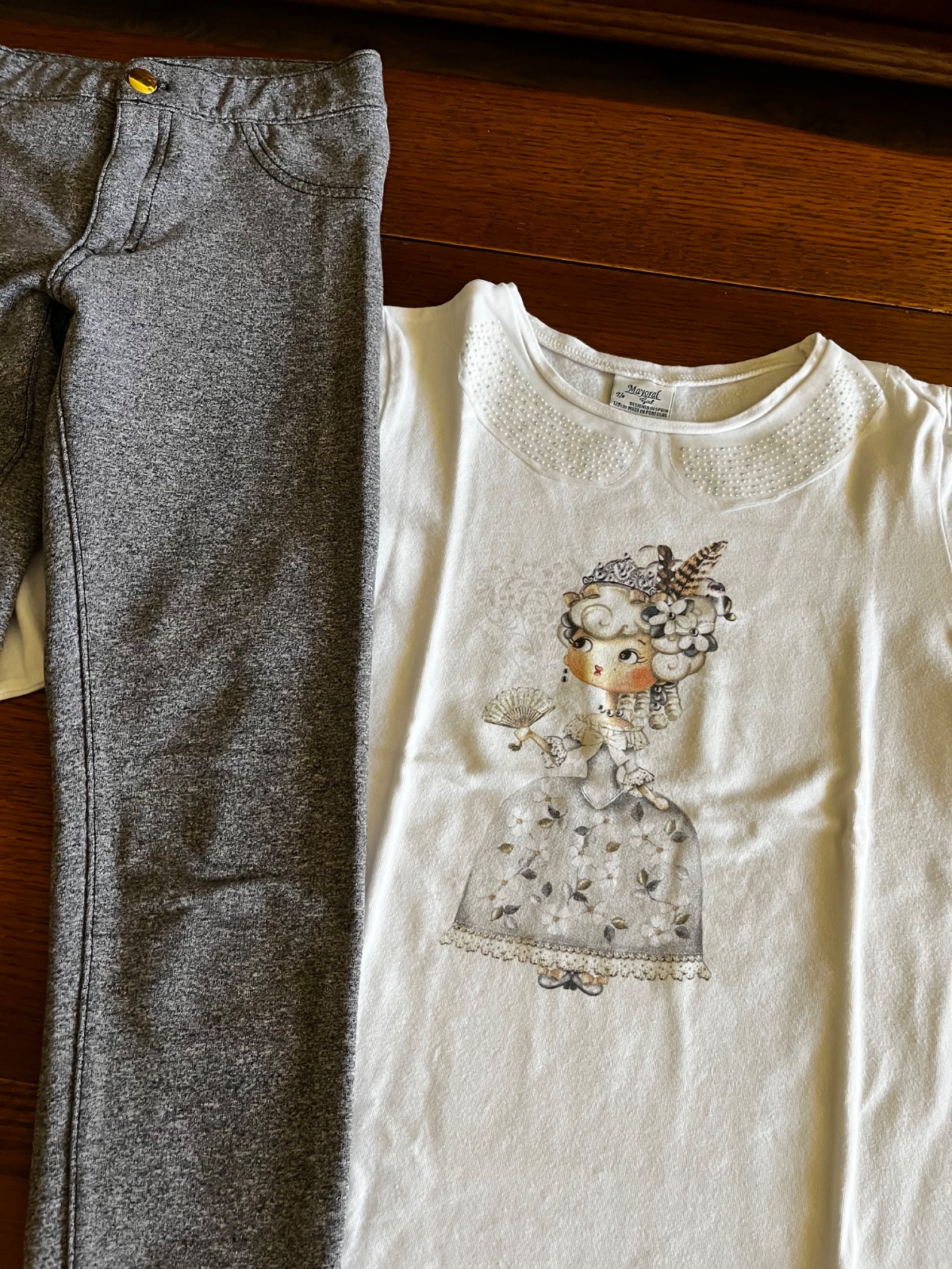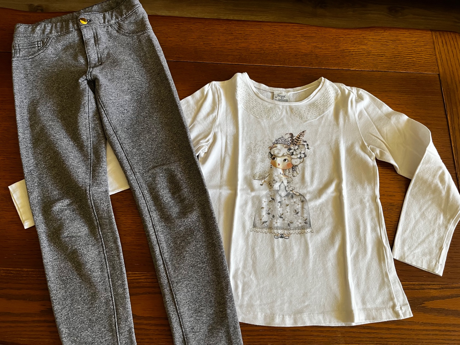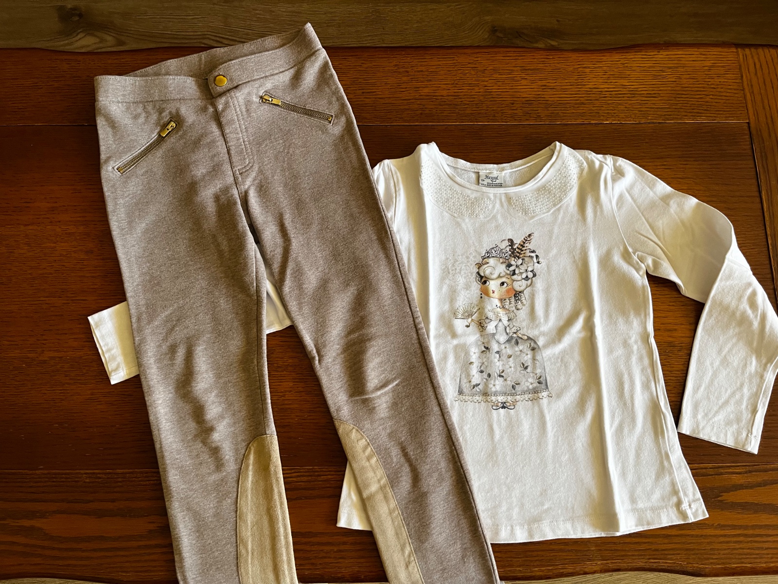 Ku tričku máme na dokombinovanie tmavošedé a bledohnedé jegginsy (viď posledné detail fotky).