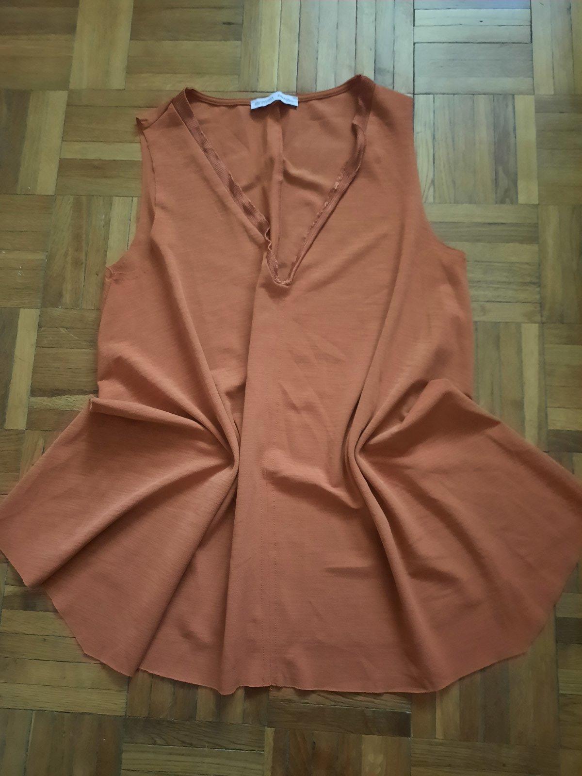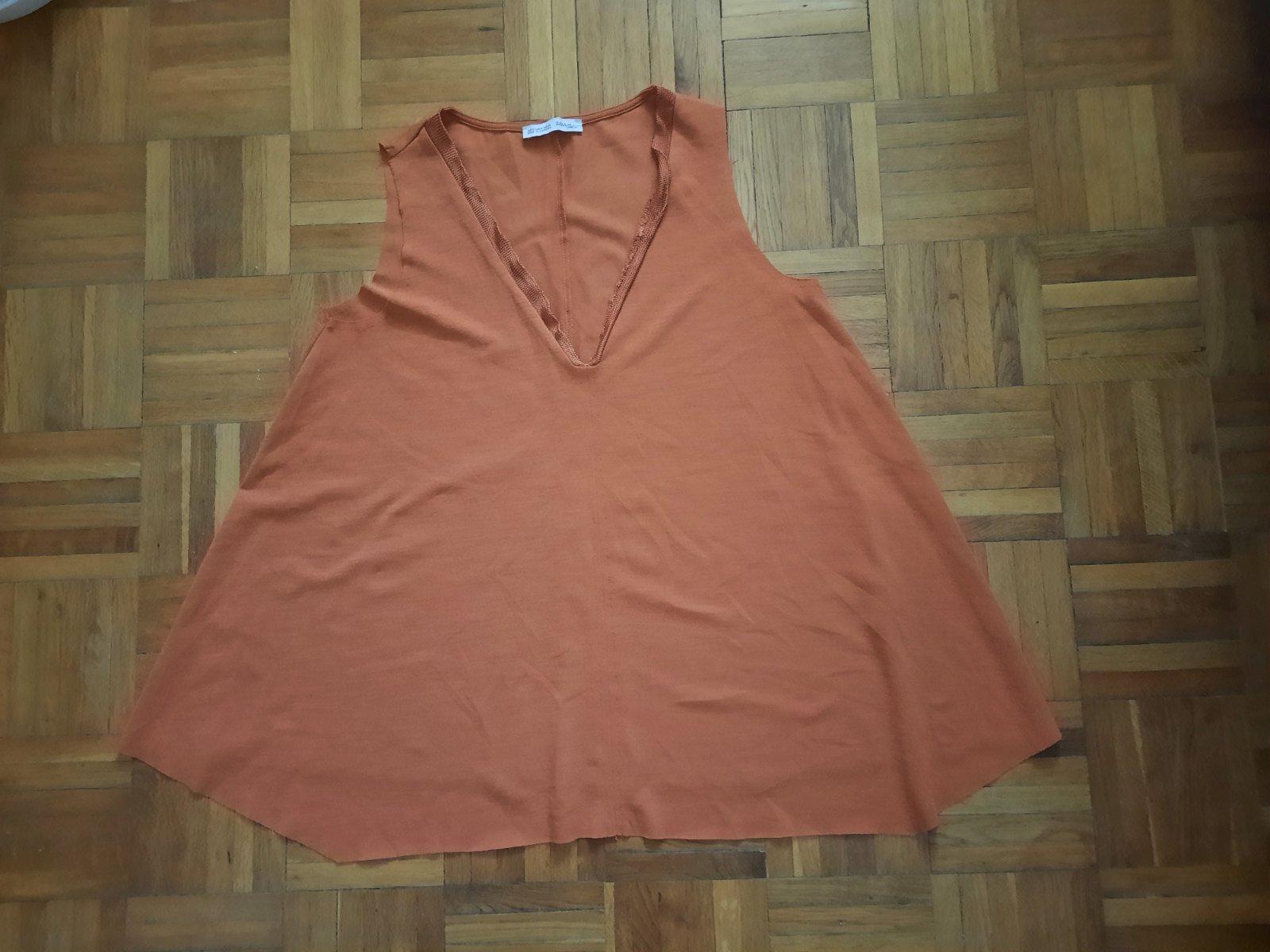 Pekný voľnejší, ležérny dámsky top s výstrihom do V, kde je olemované ozdobnou stuhou. Má príjemný materiál. Farba je taká tehlová. Keďže má voľnejší strih, sedí aj na M.