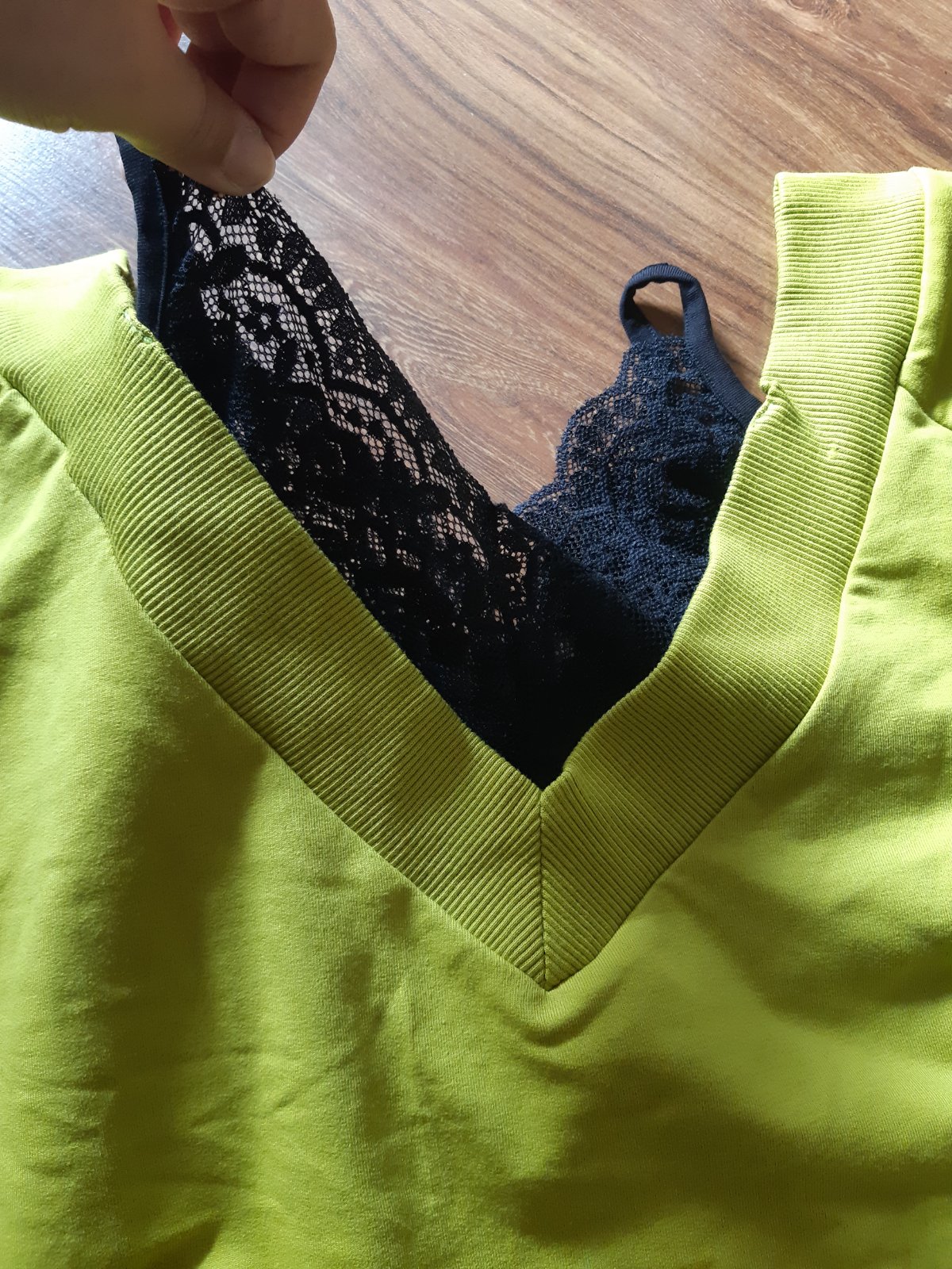 Materiál je taký mikinový. Na krku má všitú čipku, zaujímavo to ukáže. Tie rukávy majú byť tak nižšie položené akoby až na ramenách. Farba je taká žlto/zelená. Nieje žltá, ani zelená, je taká výrazná. Veľkostne je to UNI, ale sadne na L/XL. Nebolo nosené, len visačku som odtrhla.