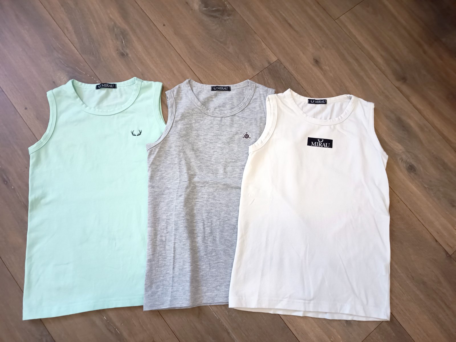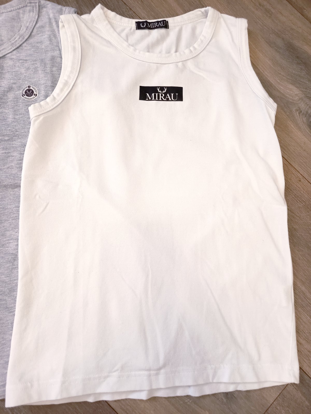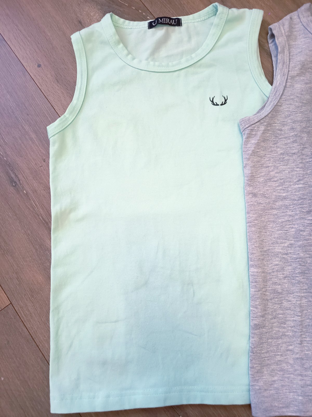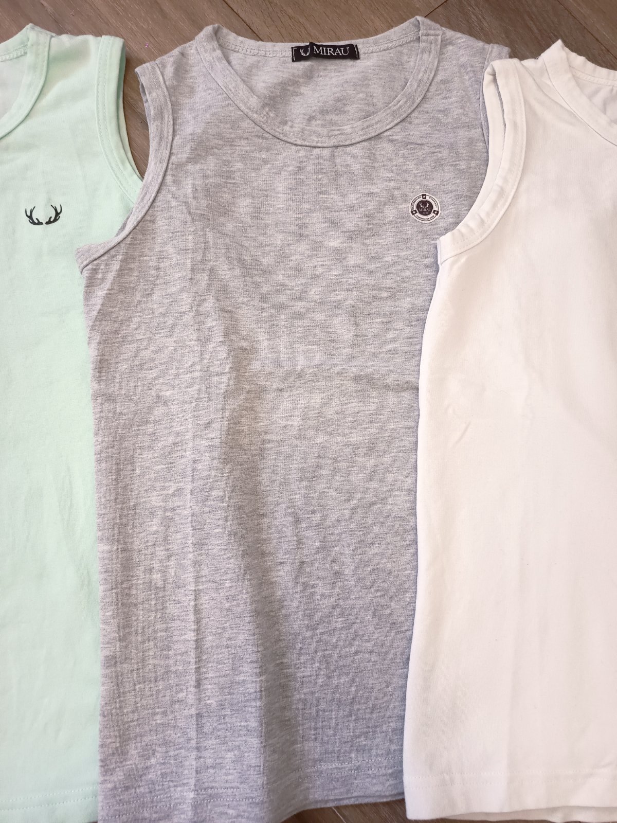 3 ks krásnych letných tričiek bez rukávov/tielok (mentolkové,sive a biele) slovenskej značky Mirau. Sú kvalitné,látka veľmi príjemná, sivé má spodný lem zvnútra kúsok odparany (na foto) ale pri nosení to nevidno keďže je to zvnútra. Inak veľmi pekný stav :) Dĺžka od ramena cca 49-50 cm. Predaj aj cena za všetky 3 ks spolu (5€/ks).