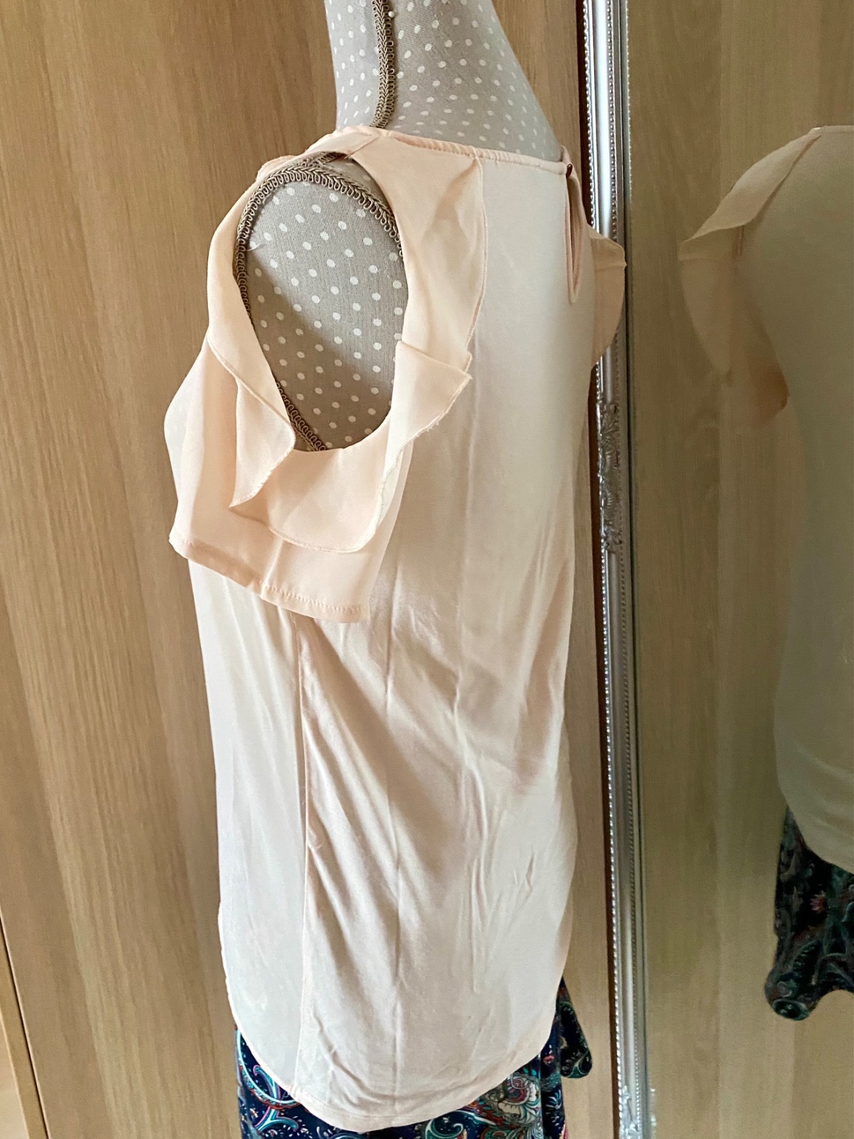 Pekné blúzkové tričko a bez poškodenia, púdrovo-marhuľová farba; rukáv cold shoulder - odhalené plecia s volánom, vzadu gombík a slzička