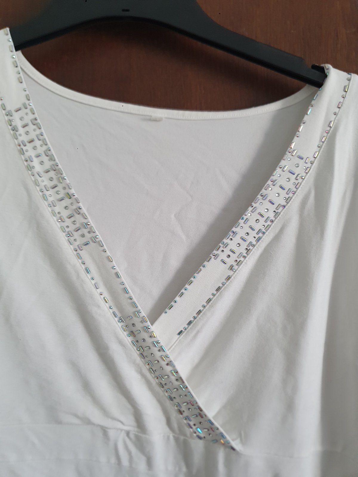 Krásne zdobené biele tričko so zdobením. Veľkosť L. Je elastické prispôsobí sa. Je super napr aj pod sako. Šírka cez prsia vkľude 53cm x 2. Natiahne sa aj do 60 cm.