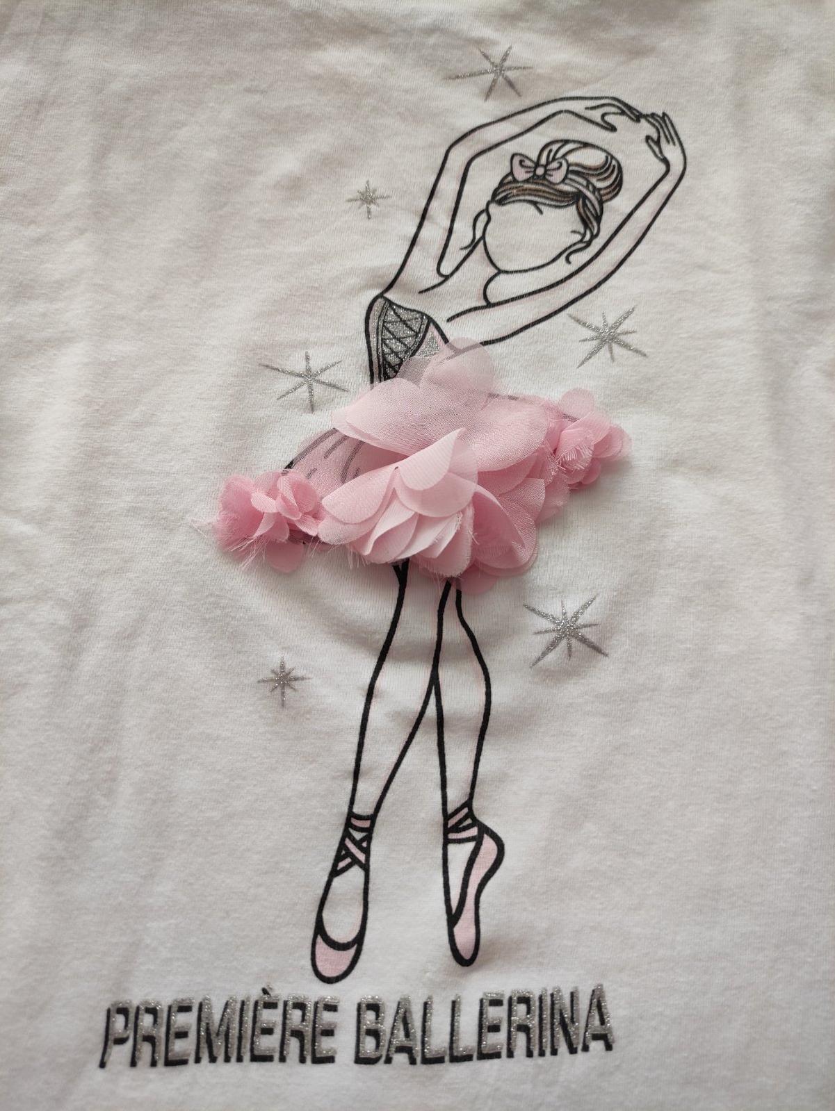 Predam pekne tricko s balerinou, prijemna makucka bavlna, aplikacia nafotena (kvetinky sa trosku strapkaju), inak krasne, rozmery: hrudnik 42x2cm, celkova dlzka 52cm, dlzka rukavu od ramena 56cm.