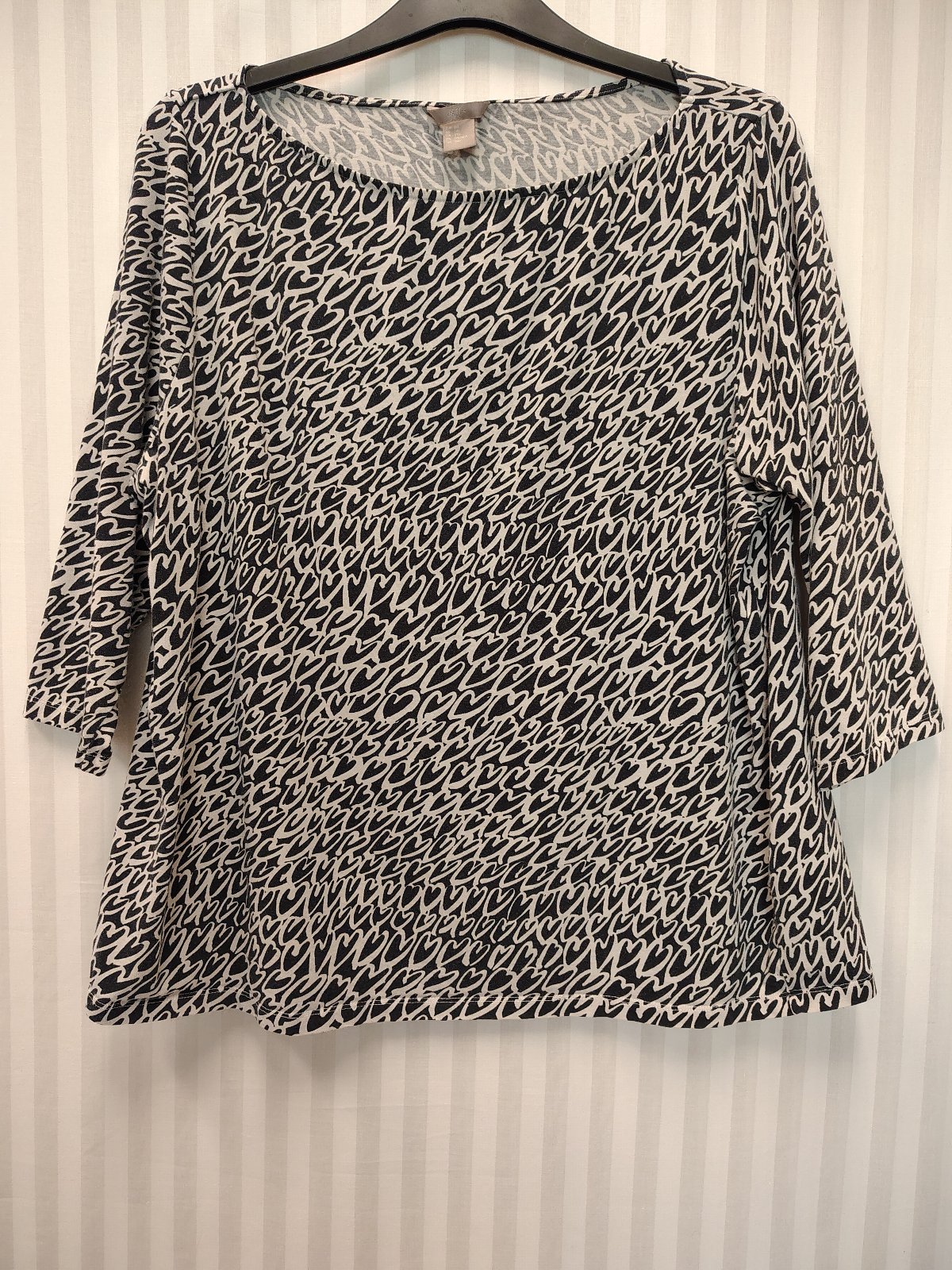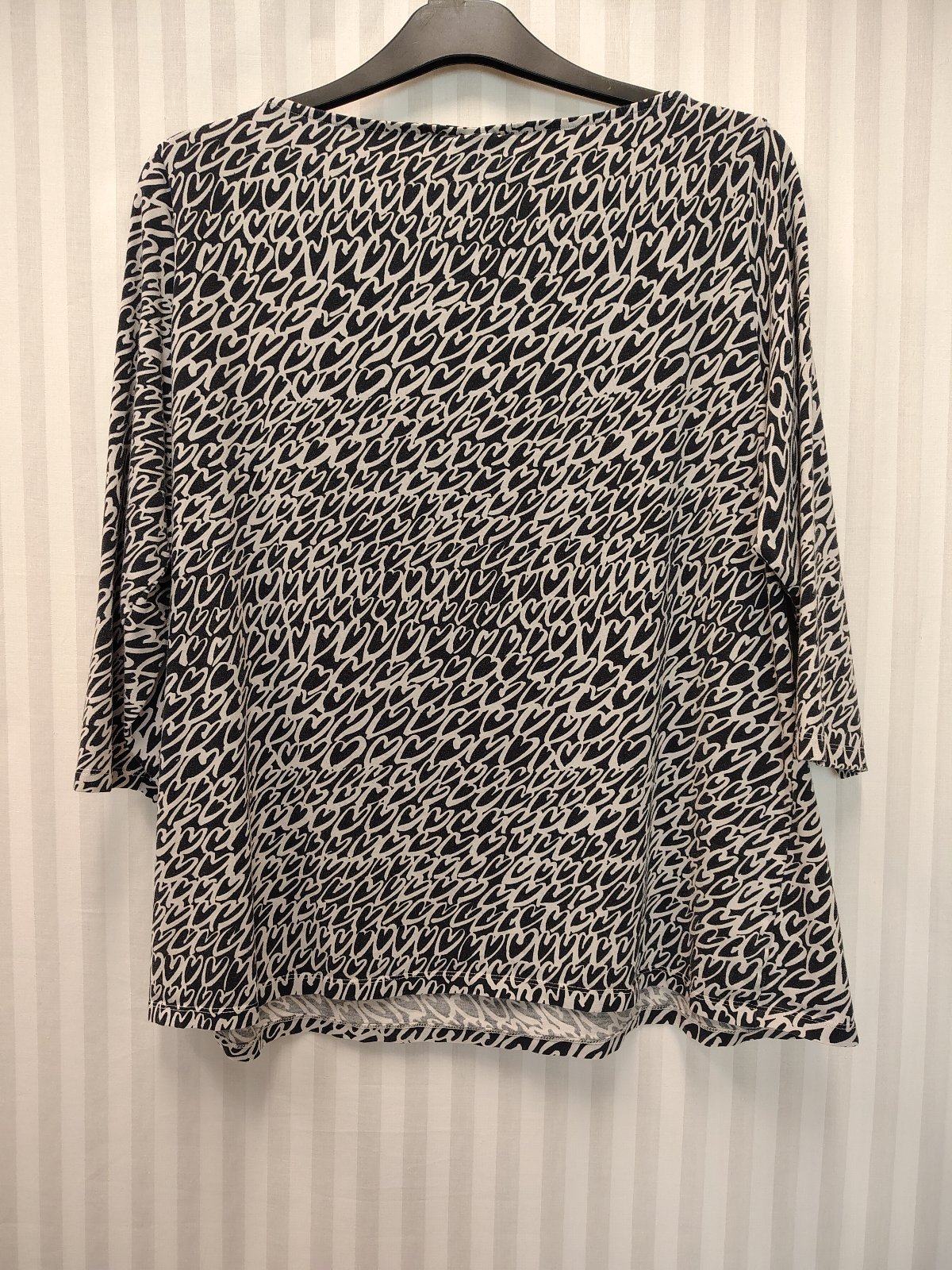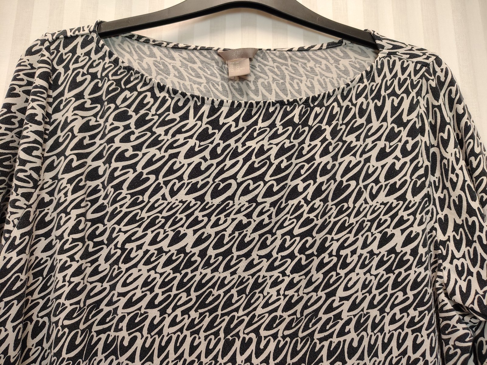 dámsky čierno biely elastický top so srdiečkovým motívom, výstrih nariasený do gumičky,