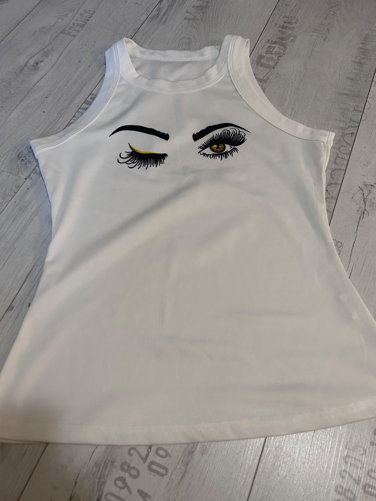 Nadherne biele body - top bez rukavikov tielkoveho strihu s vyraznou potlacou zmurkajucich ociek ,spodna cast s nasitym cvockovym zapinanim.Material elasticky polyester. Dokladam real foto!!! Vel...
