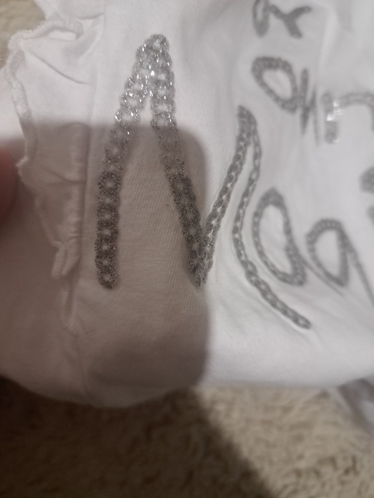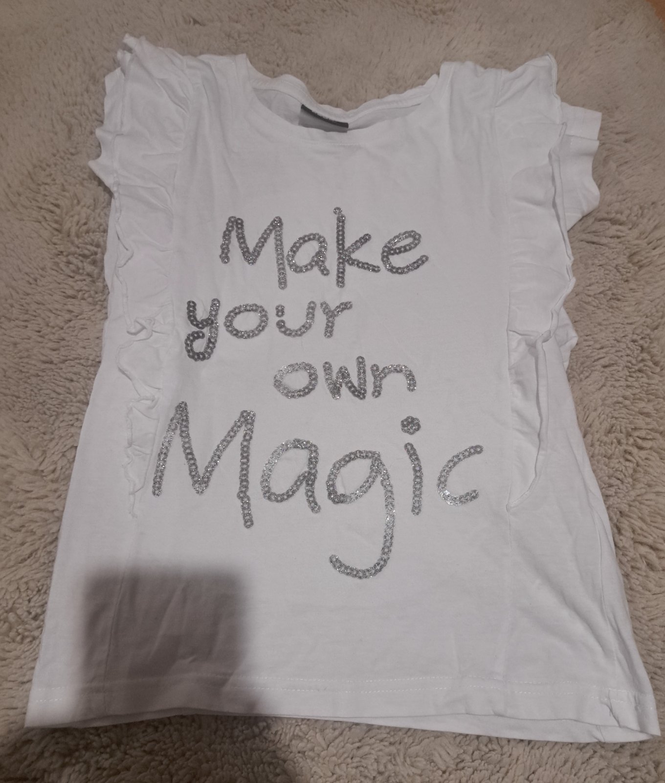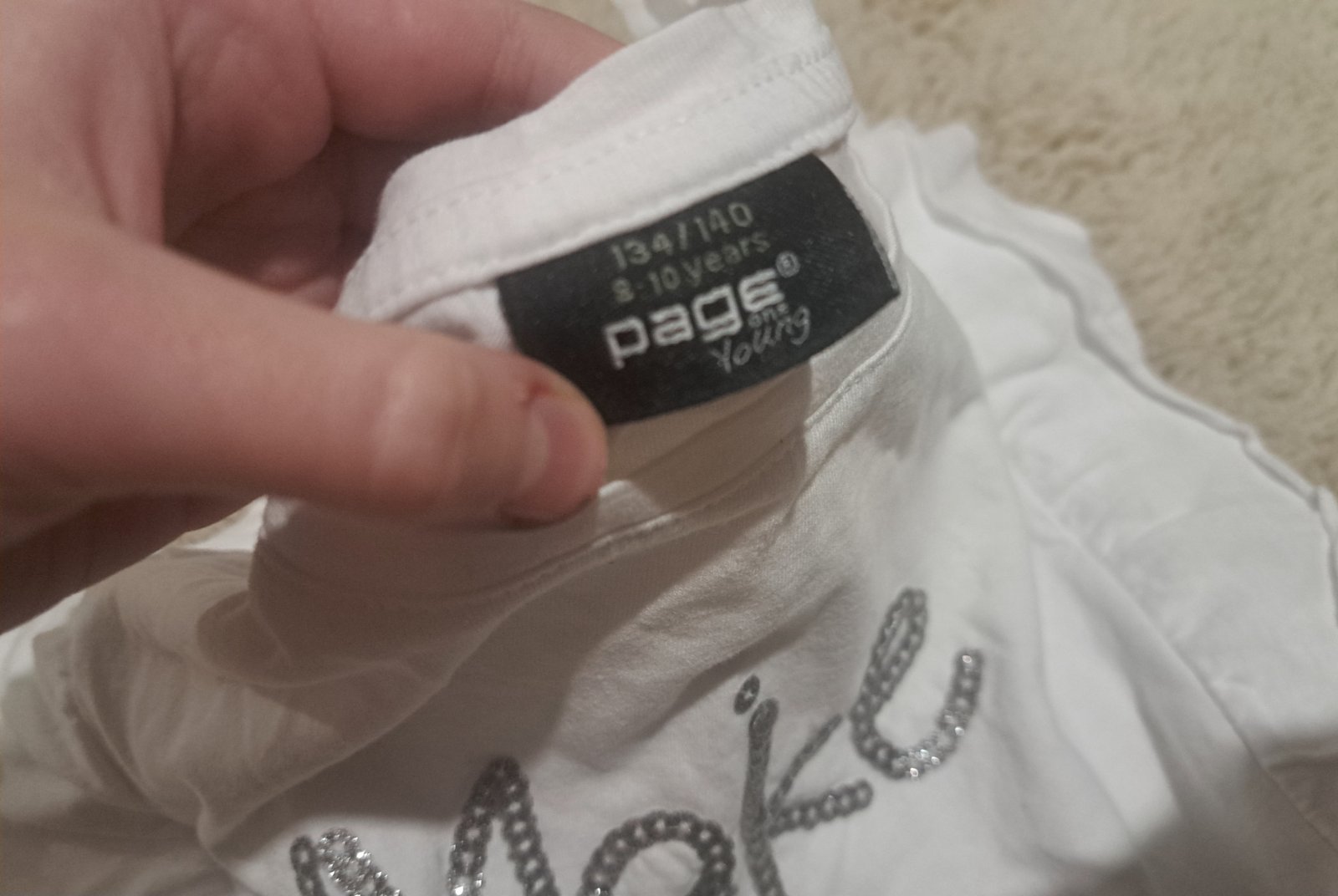 Ani neoblečene tričko.Veľkosť je 134/140.Na rukávov je menší detail.