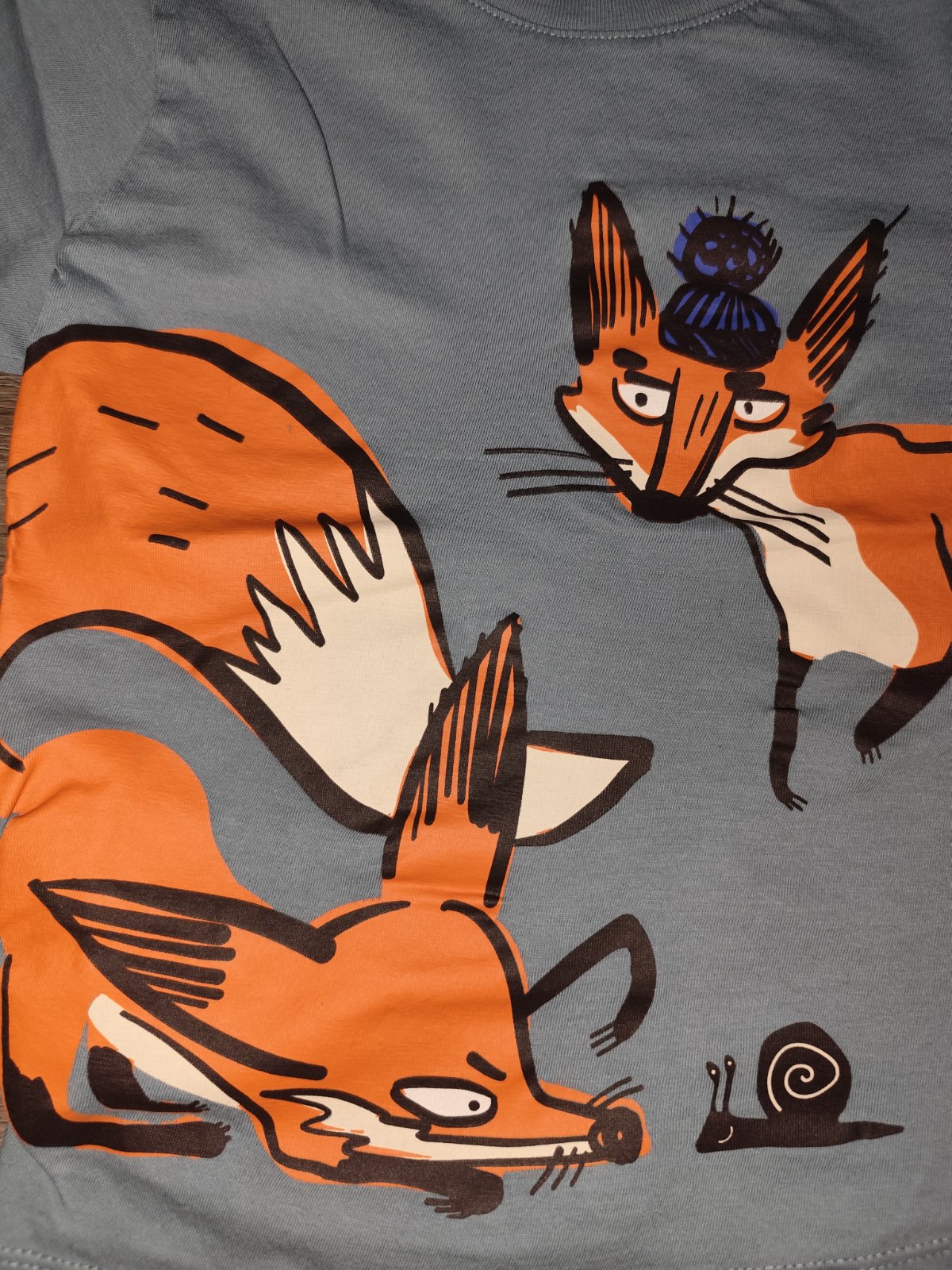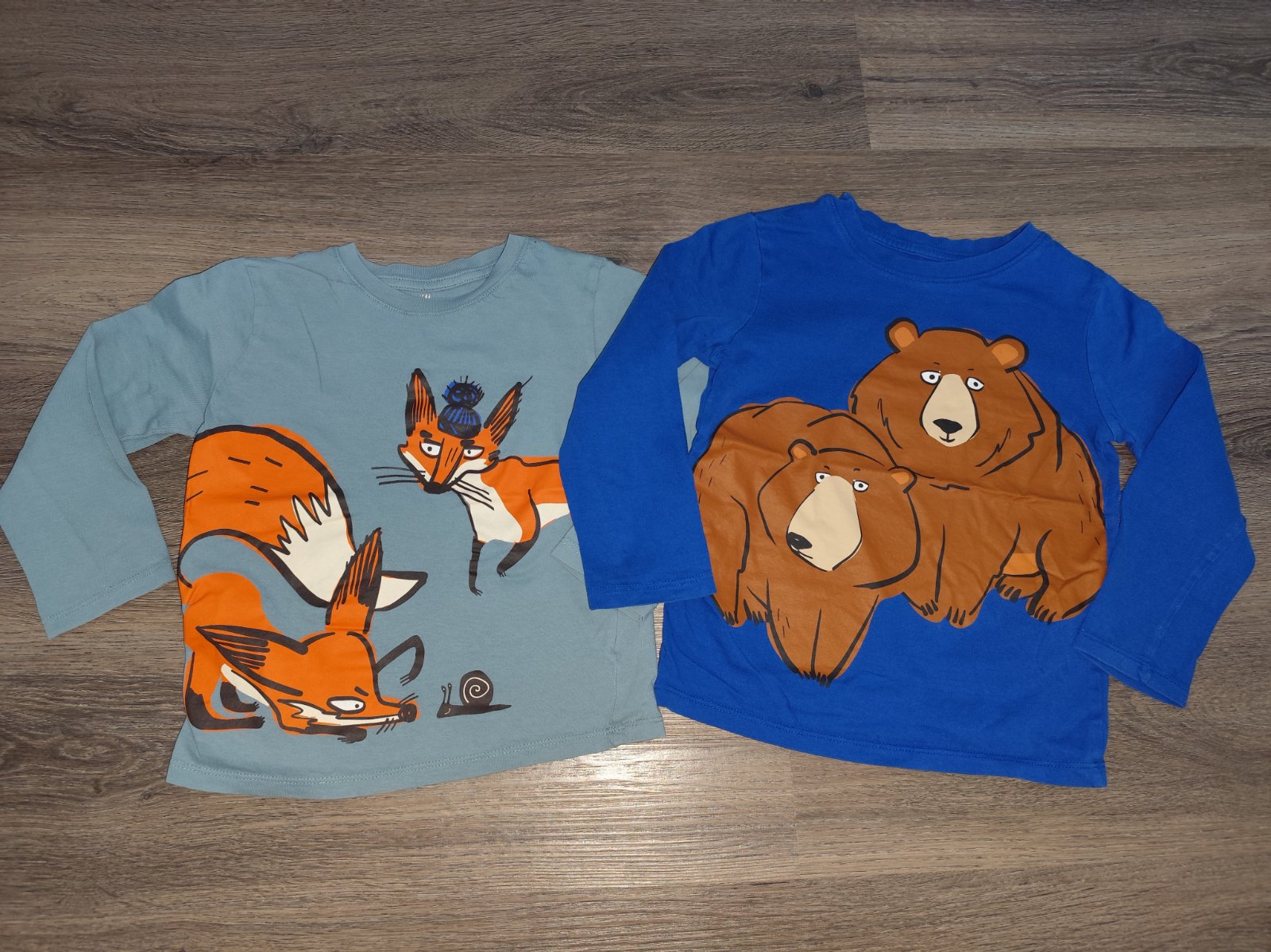 Predám dve tričká značky H&M, veľkosť na štítku uvedená 110/116 s medveďmi a líškmi. Obidve majú krásne sýte farby, obrázky nie sú popraskané, veľmi dobrý stav, len pri fotení som si všimla na tričku s líškami na ľavom rukáve malú dierku, viď. foto.