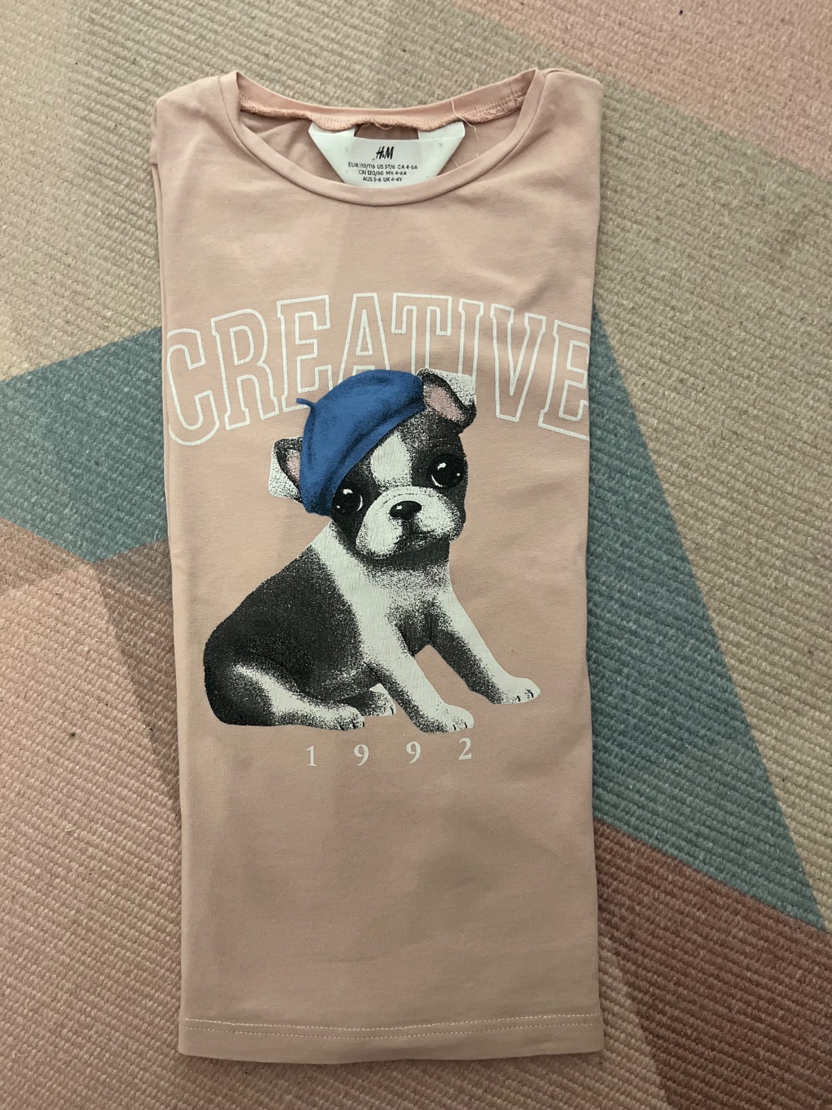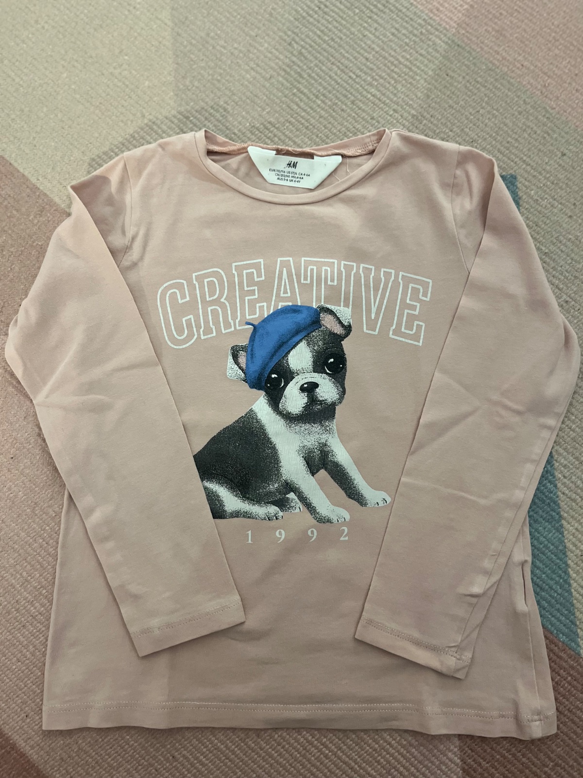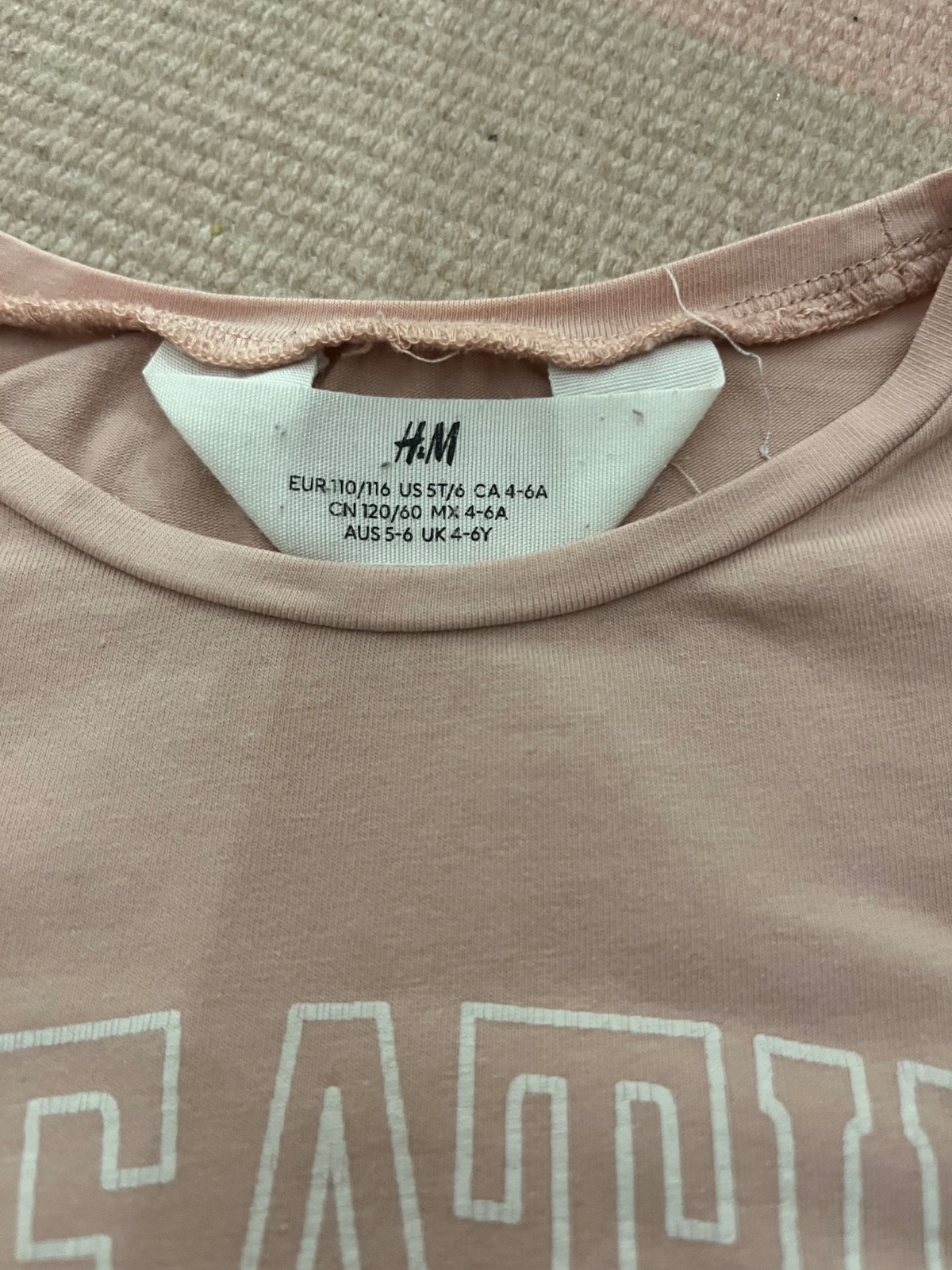 Obľúbené tričká H&M, veľkosť 110/116 v peknom nosenom stave. Na ružovom drobný fliačik, viď foto. Spolu za 4€.