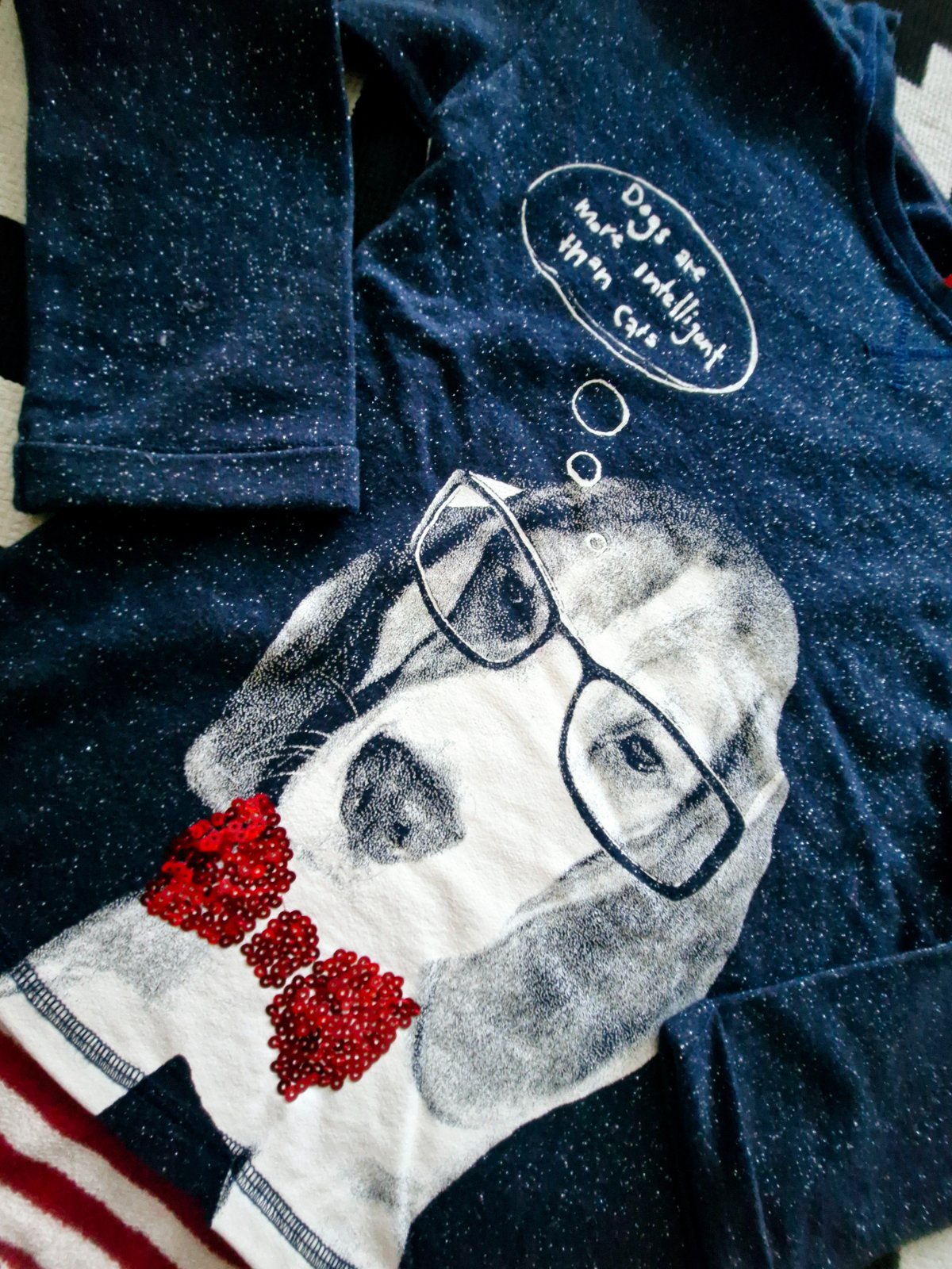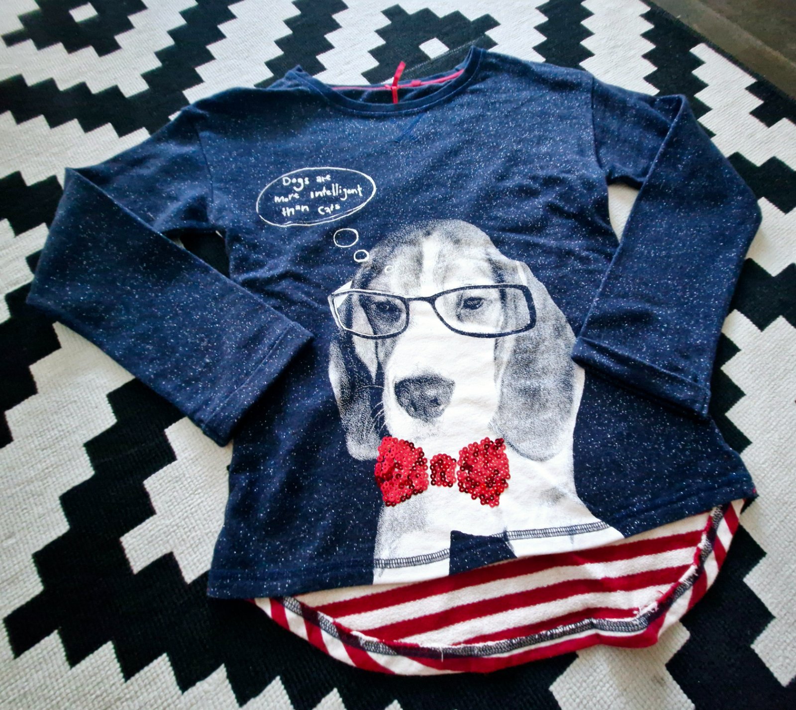 Nadherna tricko-mikinka,jemne trblietava s krasnou potlacou verneho psika s okuliarmi,motylik flitrovany,krasna...super stav,cea LEN 9eur...velmi odporucam