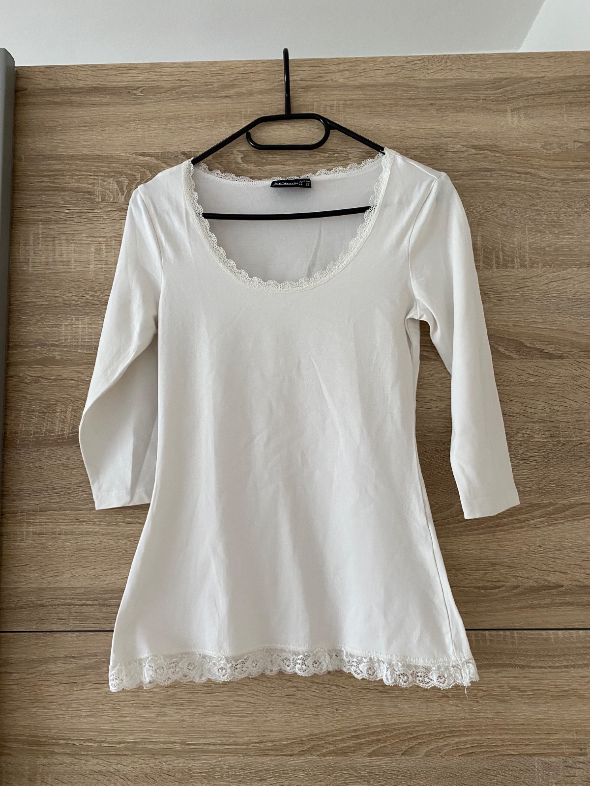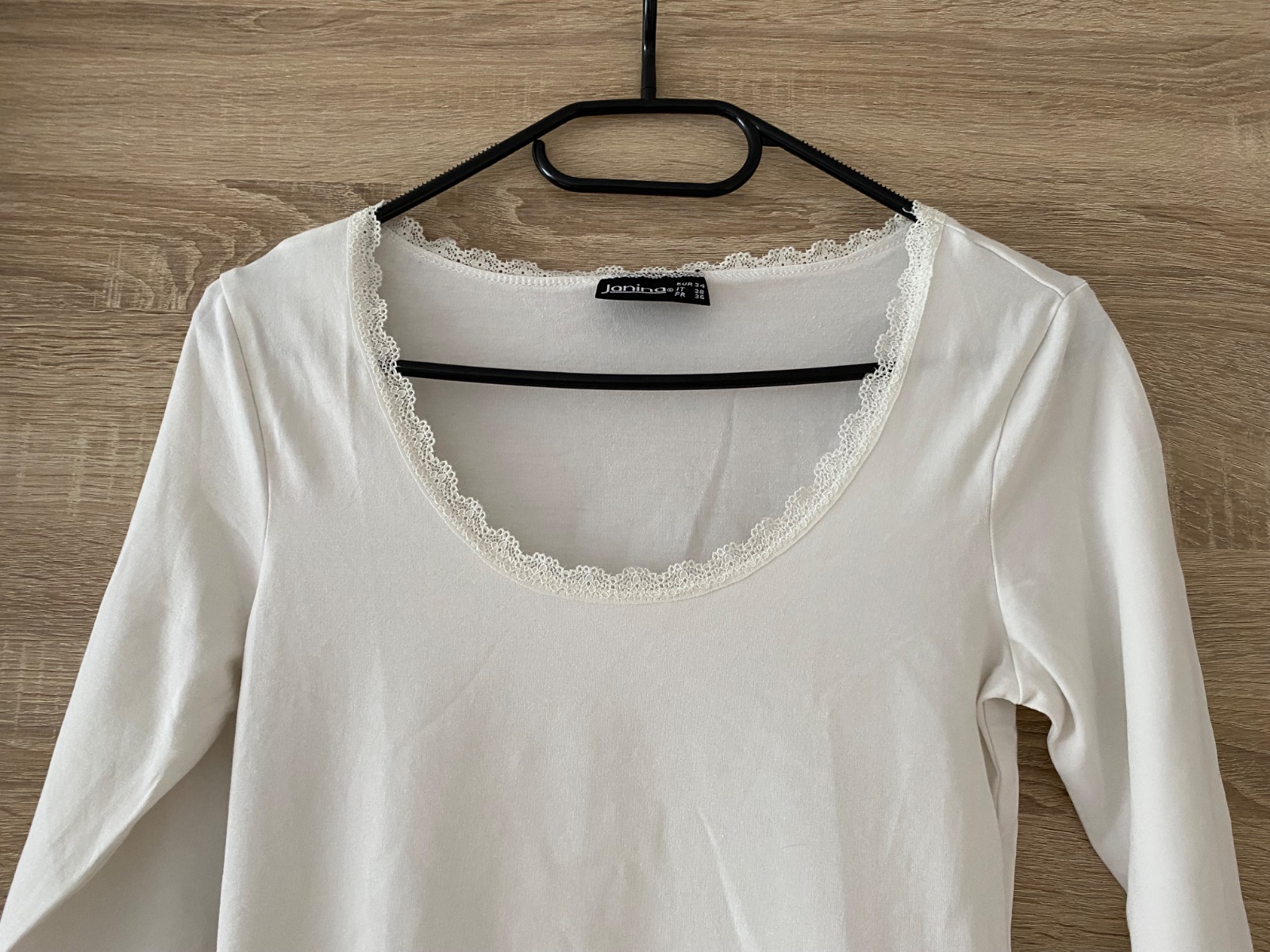Obvod hrude 2x36cm, dĺžka trička 61cm, dĺžka rukáva+pleco 45cm, značka trička Janina, 95% bavlna