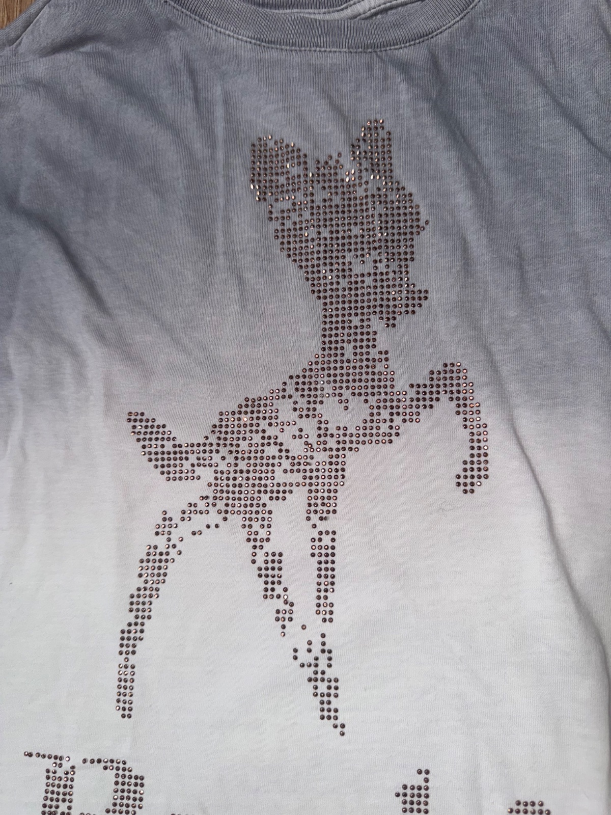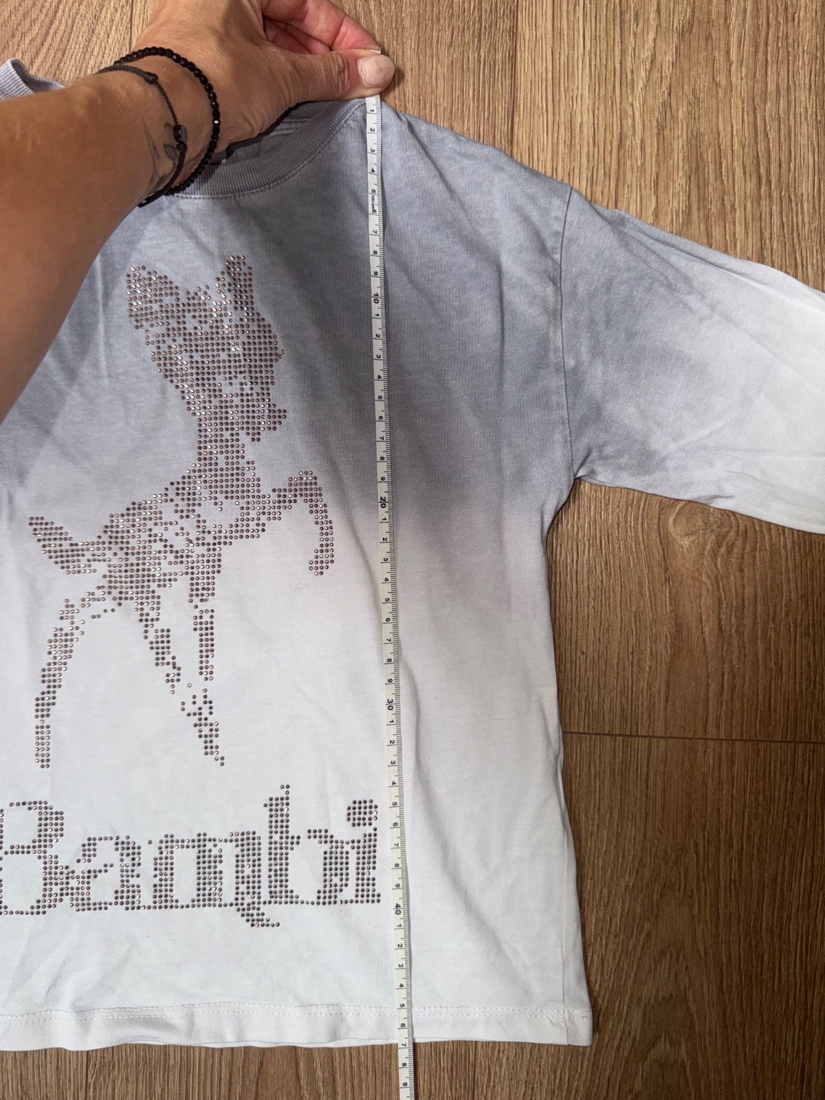 Veľmi pekne tričko Bambi - jedno z našich naj, ku všetkemu sa hodi, take volnejšie pohodlné, rukav akoby taky 7/8. Vo velmi peknom nosenom stave, akurat z tych kamienkov chyba, ale nie je to nič strašne, vyzera to skoro akoby to tak malo byť, v pohode nositelne aj do školy ešte - kuk fotky