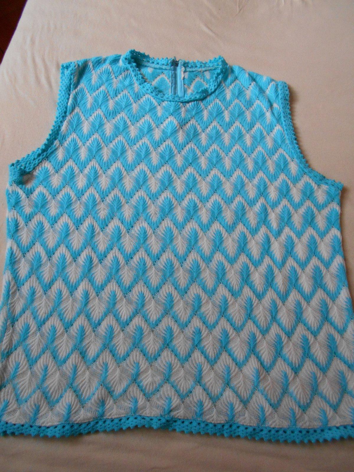 Tričko je farby ako na fotke biela a jasno modrá, Je ku krku ,olemované ako i okolo rukávov a spodku.V zadu má malý zips. Je v zachovalom stave
