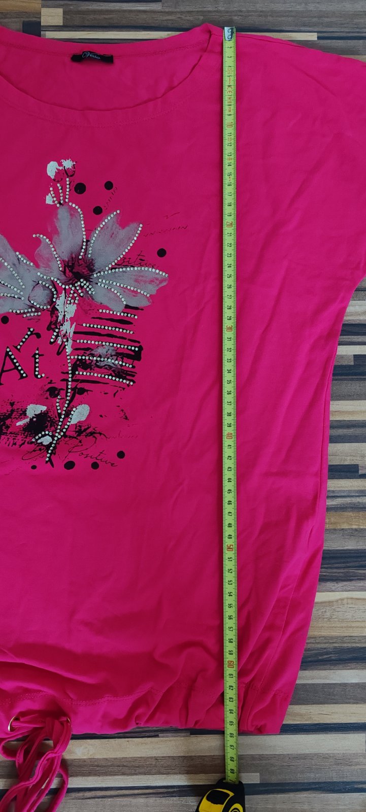Nepíše na nom velkost, sedí na velkost M/L, rozmery sú na foto v inzerate, v spodnej strany tricka je šnúrka na stiahnutie