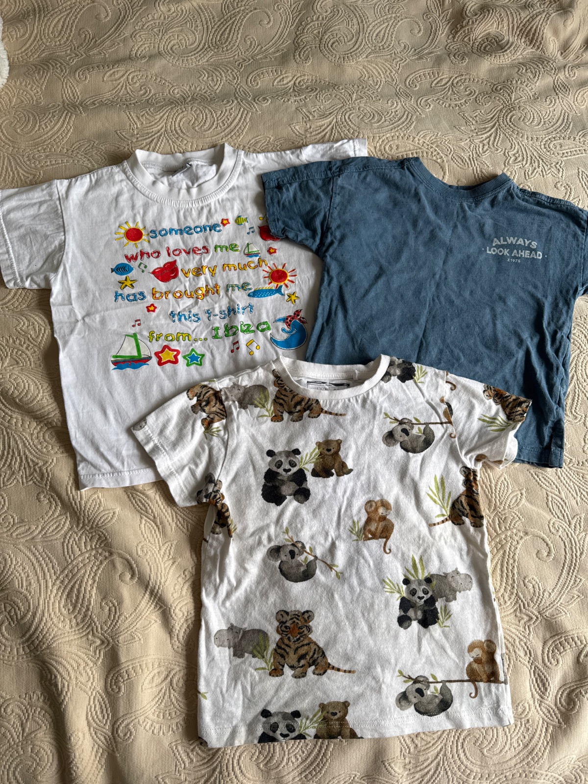 3 tricka, sedia na veľkosť 110-116. Biele kúpené na Ibize, s koalkami Next a modré ZARA. Veľmi dobrý stav. Bez škvŕn. Cena spolu,