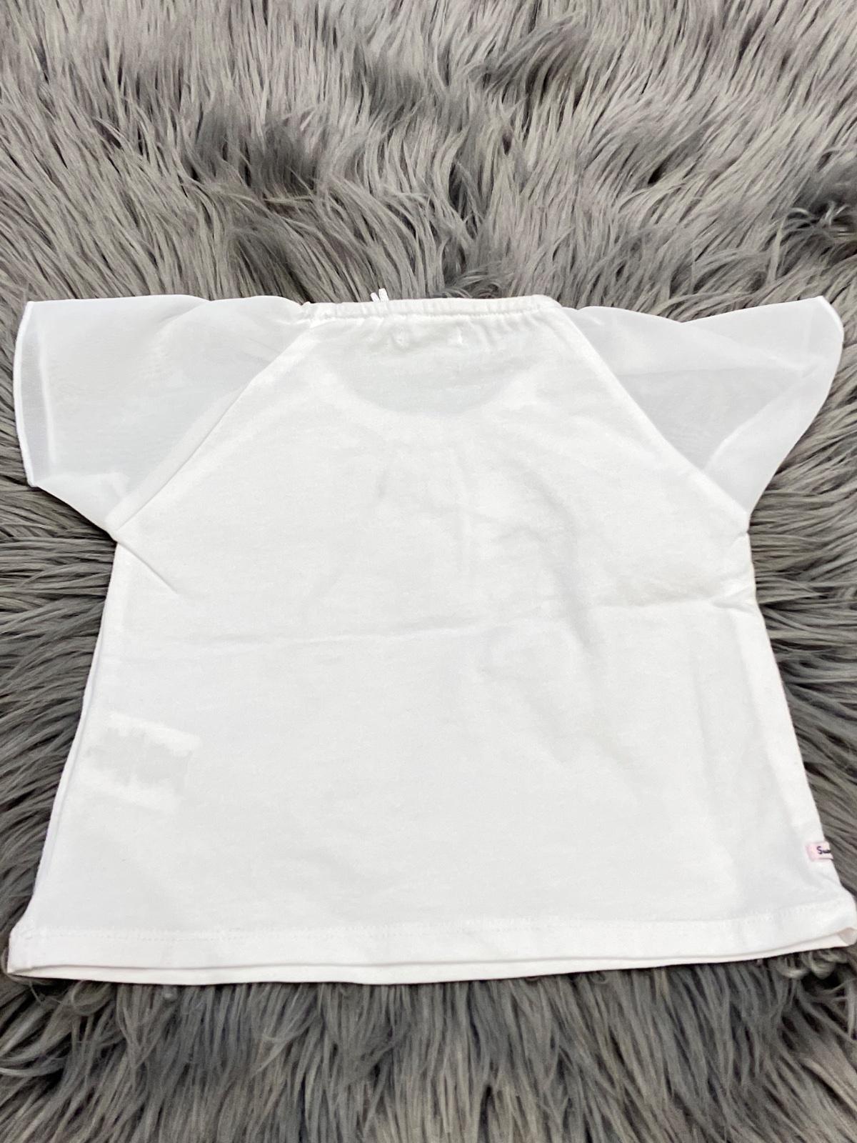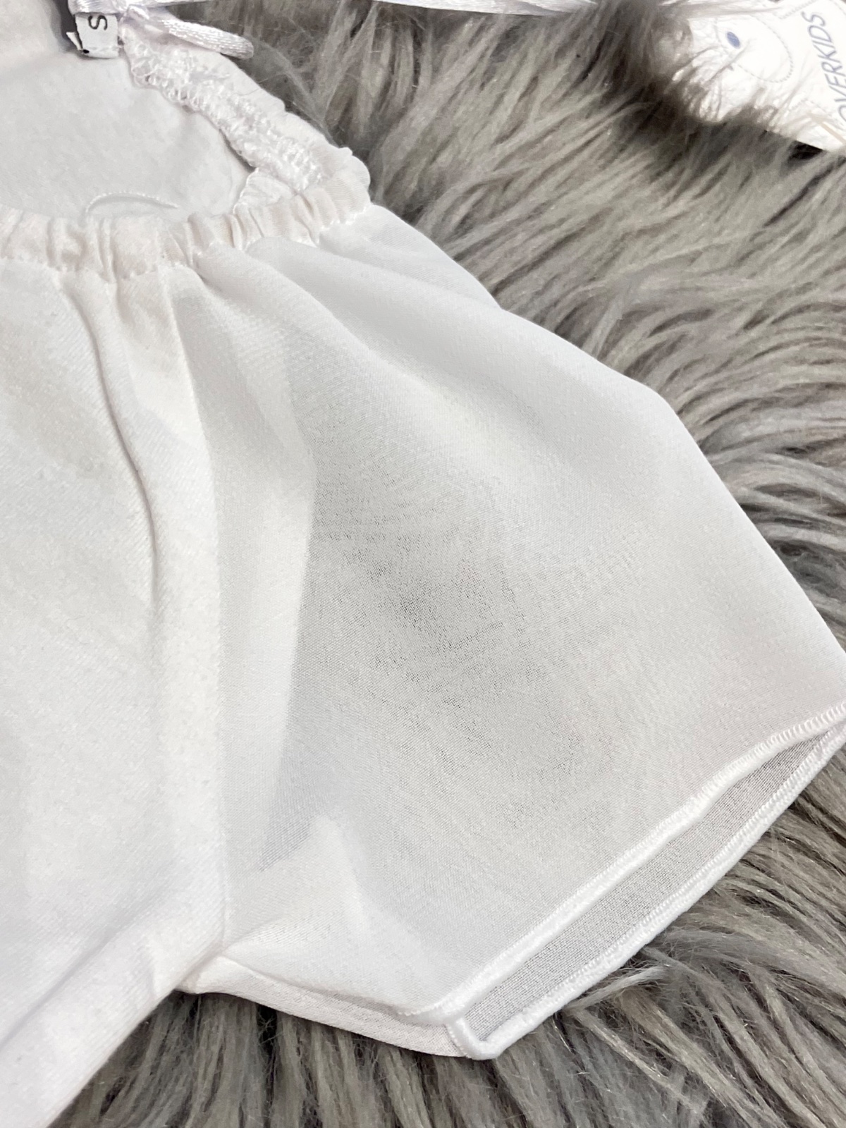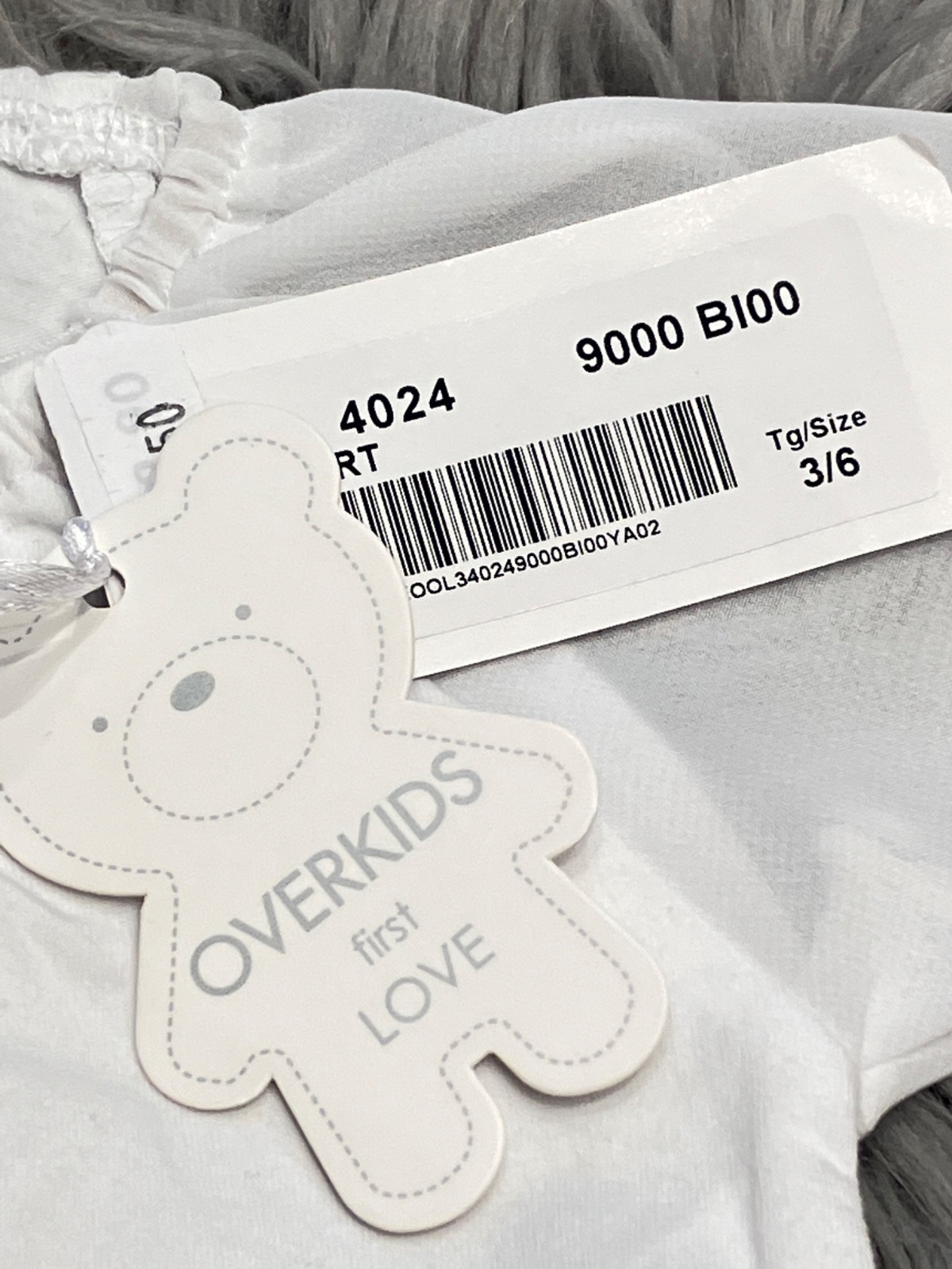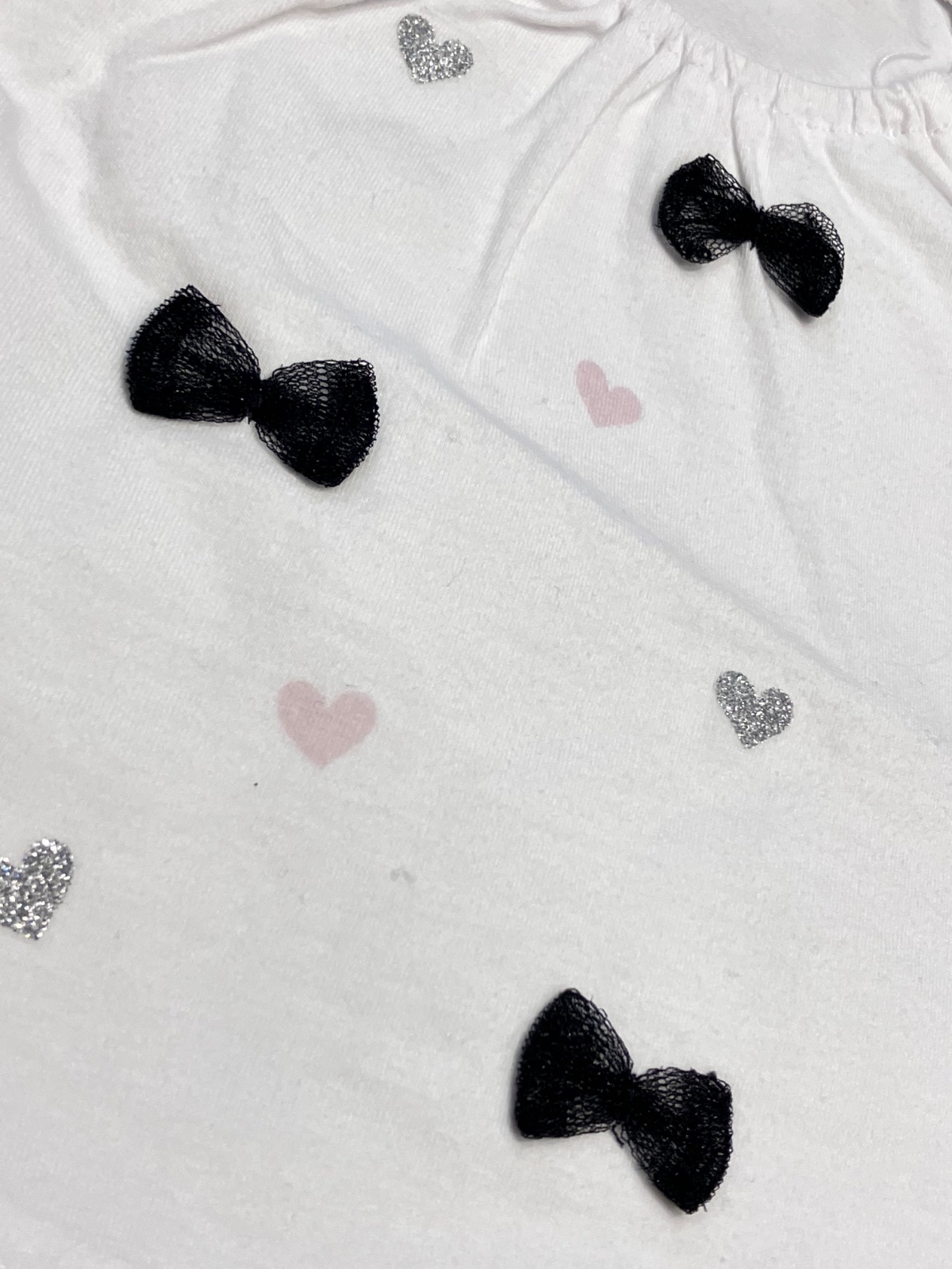 Dievčenské tričko s tylovými rukávmi značky Overkids. Motív: 3D mašličky, srdiečka ružové a strieborno trblietavé. Okrúhly výstrih na gumičku. Elastické. Pre 3-6 mes. Materiál:95%bavlna,5%elastan.