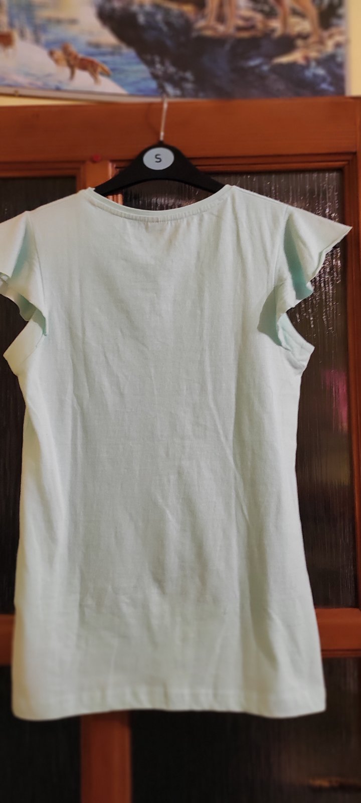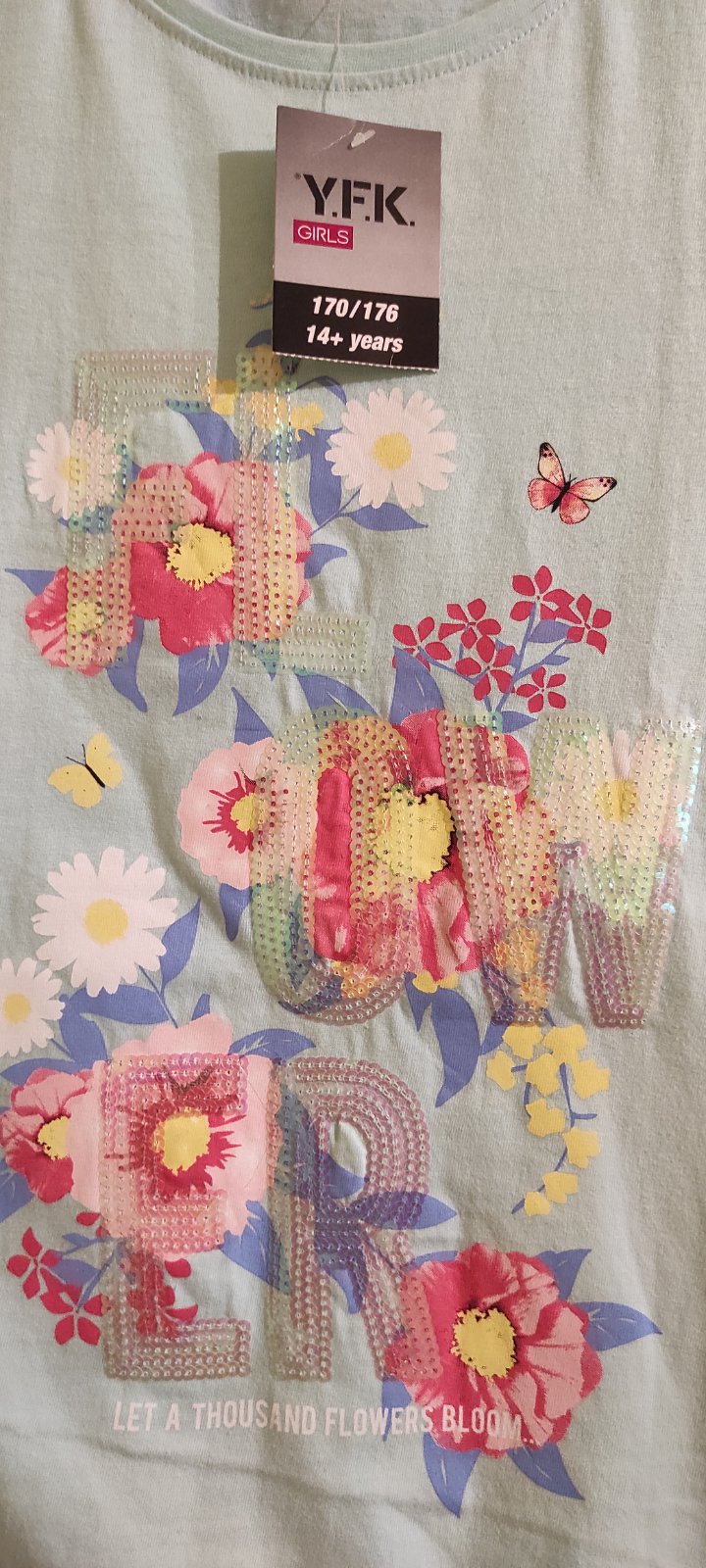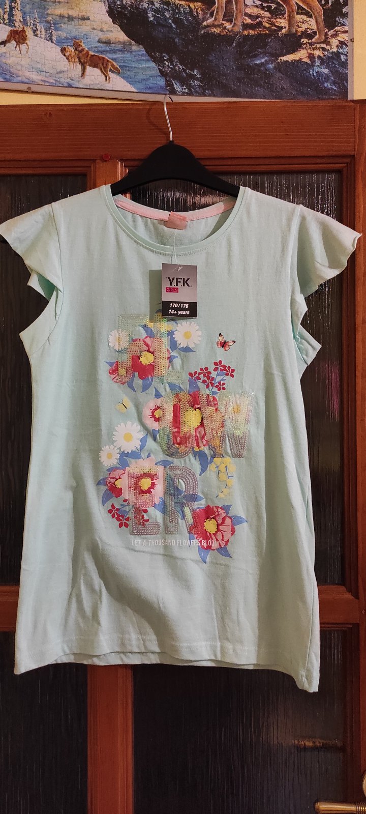 Veľmi pekné zelenkavé z flitrami a kvetmi, veľkosť 170/176/14+, materiál bavlna.