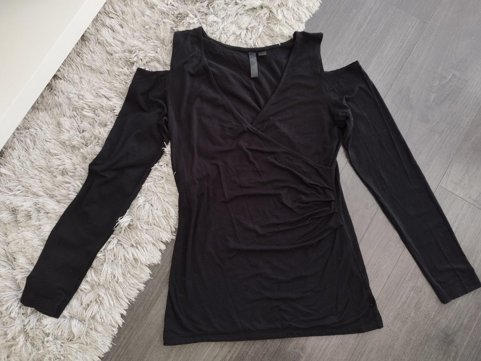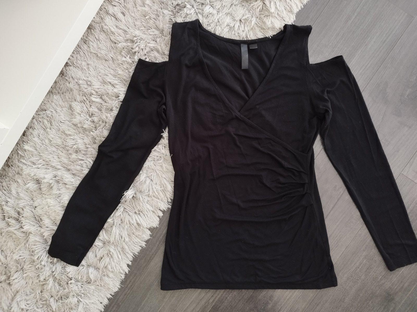 Čierne tričko s výstrihmi na ramenách. Veľmi pekné, stav je výborný až na malé žmolky. Kto vie odstrániť získa pekné tričko.