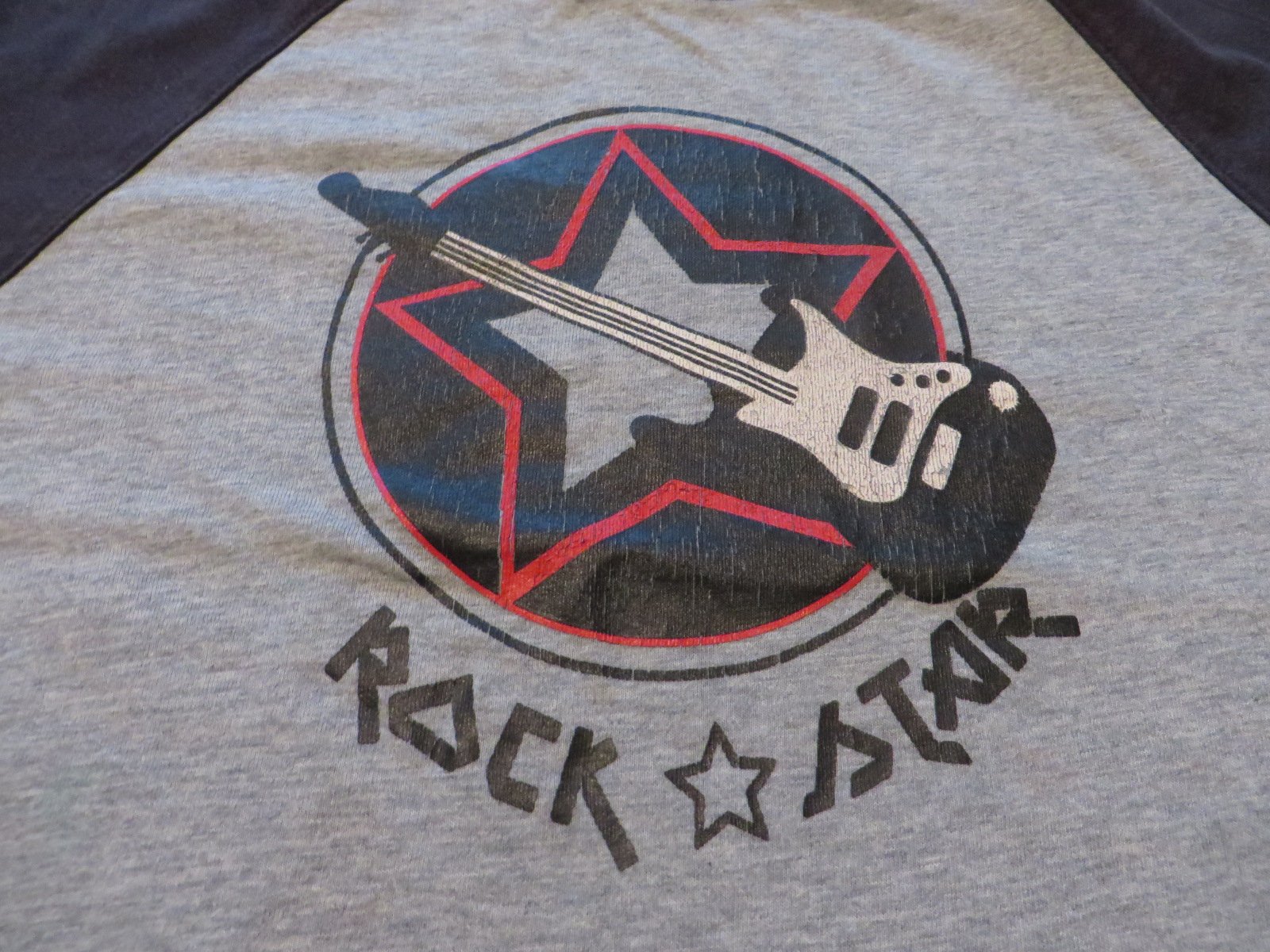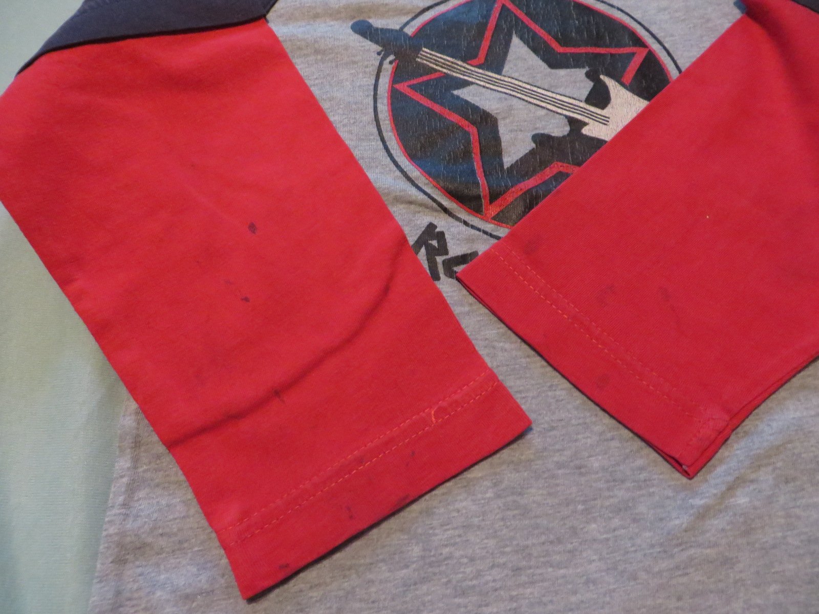 6/ šedočervené tričko s gitarou pre malého rockera, veľ. 116 - aplikácia už trošku praská, vidieť to na foto. Na rukávoch sú fliačky, je to vidieť na fotke, cena tomu prispôsobená - 1,30€