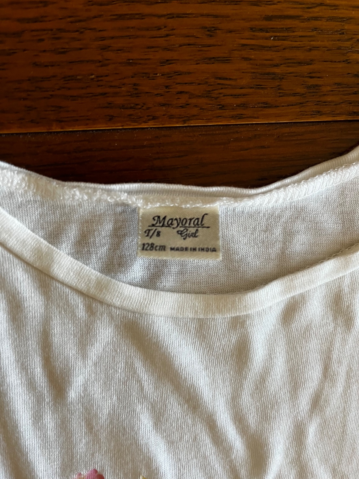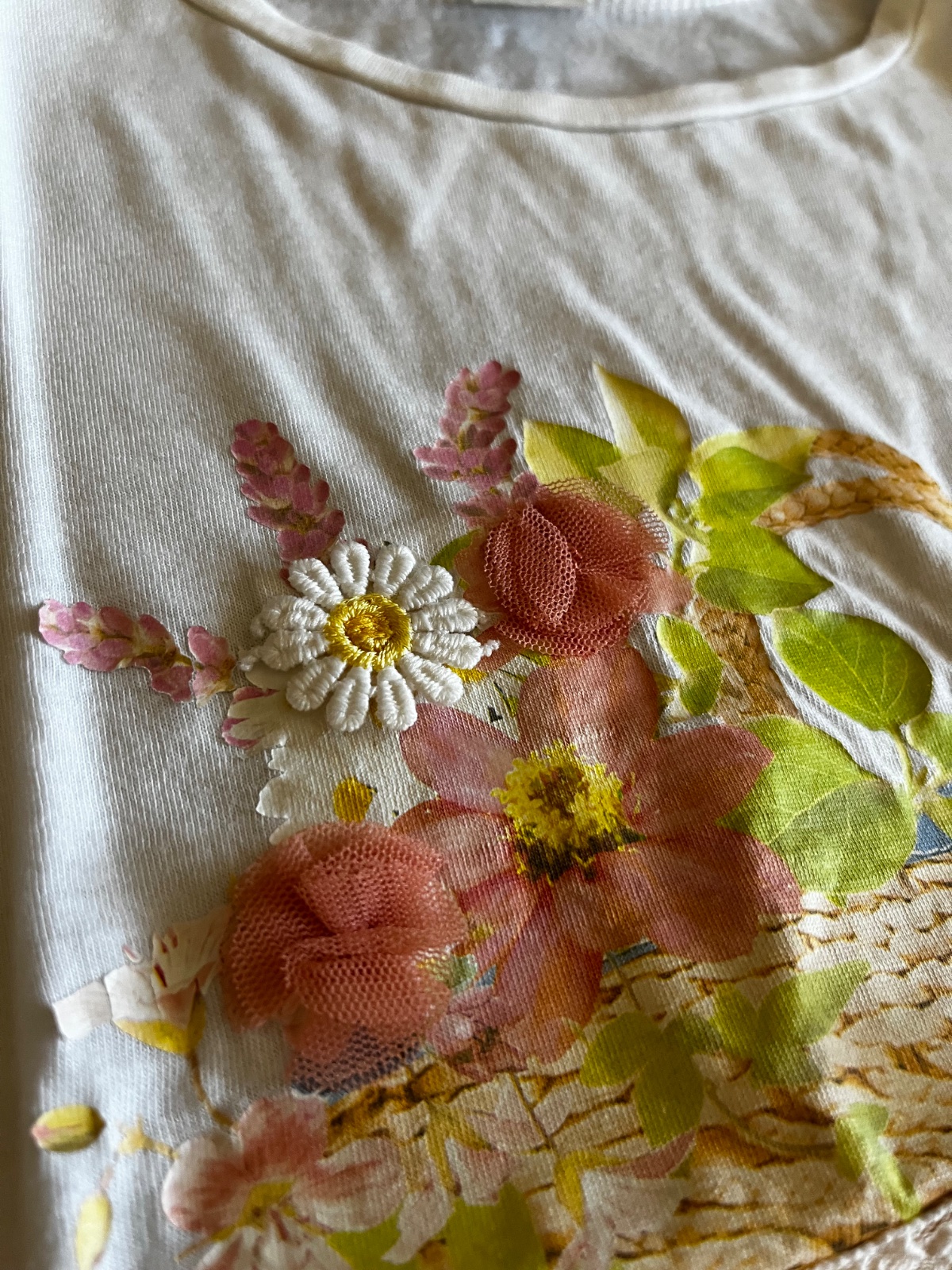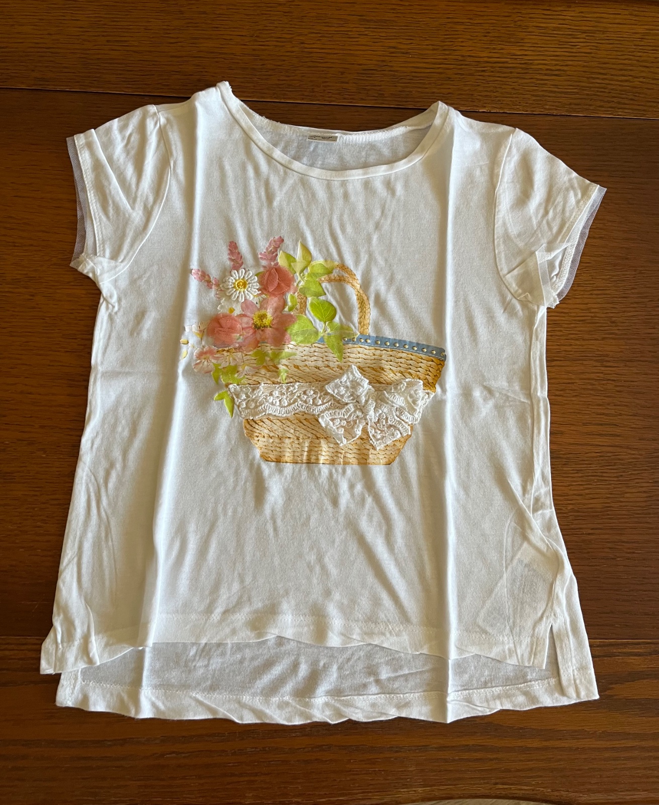 Vpredu aplikácia košíka s kvetmi, ozdobná čipkovaná stužka s mašľou, 3D margarétka. Okolo rukávov jemnučká mušelínová ozdoba.