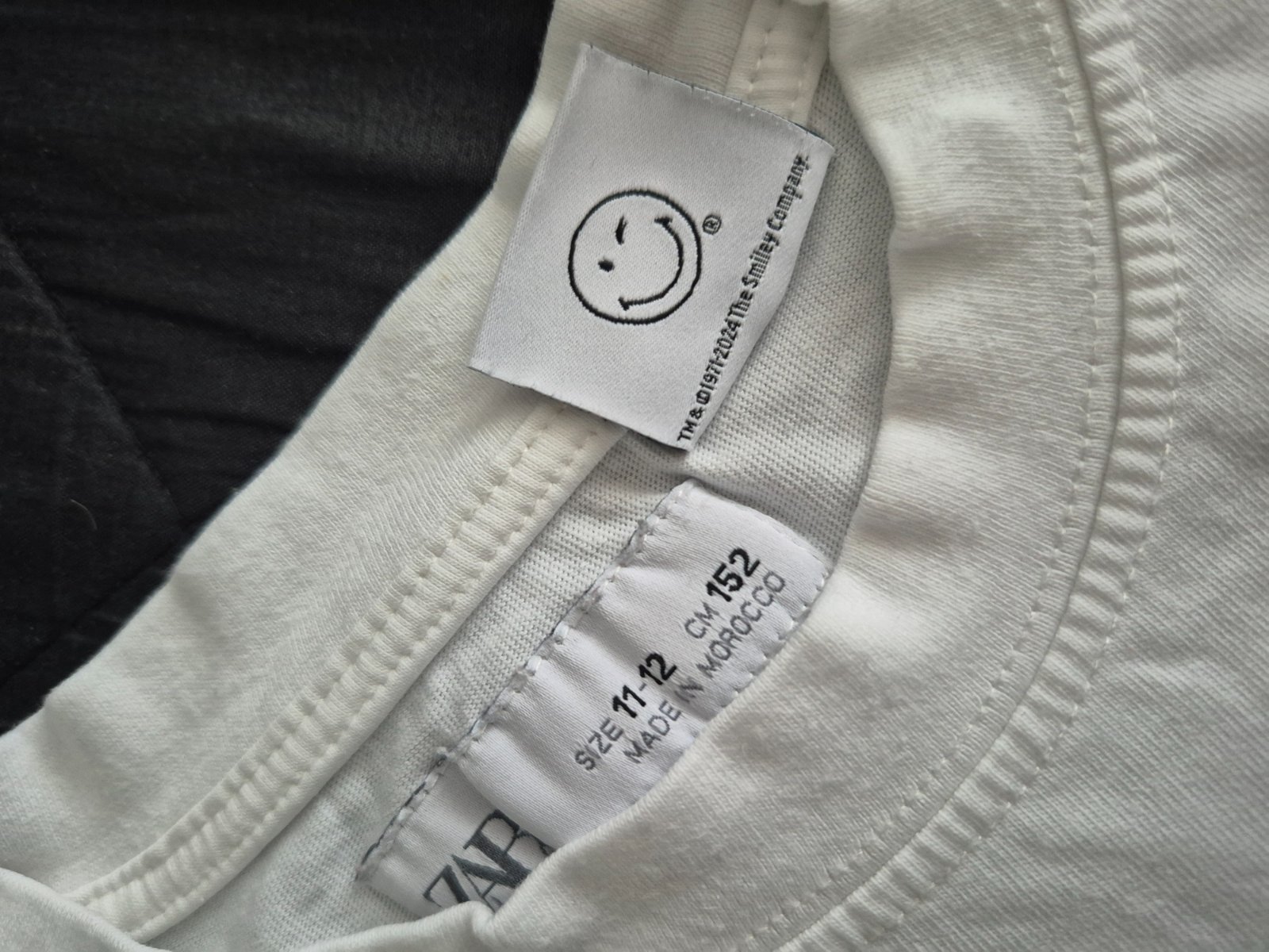 Biele tricko s riflovou nasivkou, zn. Zara, velk. 152 (aj zodpoveda). Je nosene s vela dalsimi, v dobrom stave, bez poskodeni.