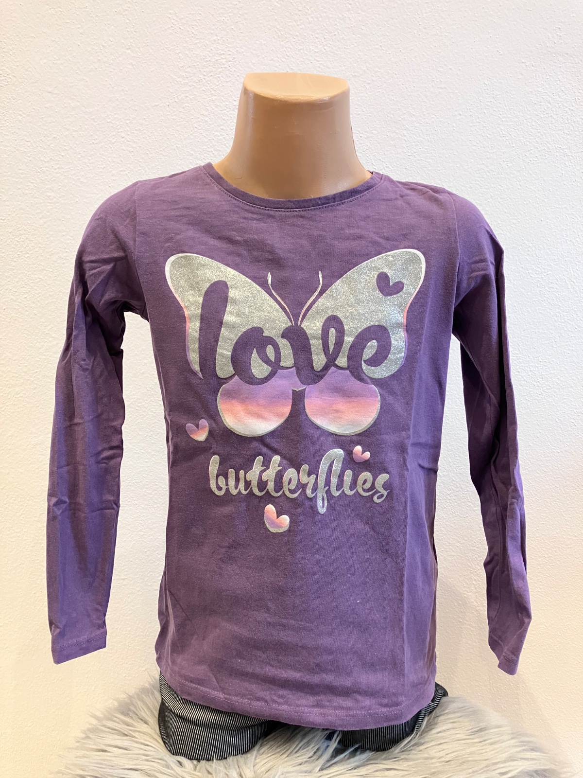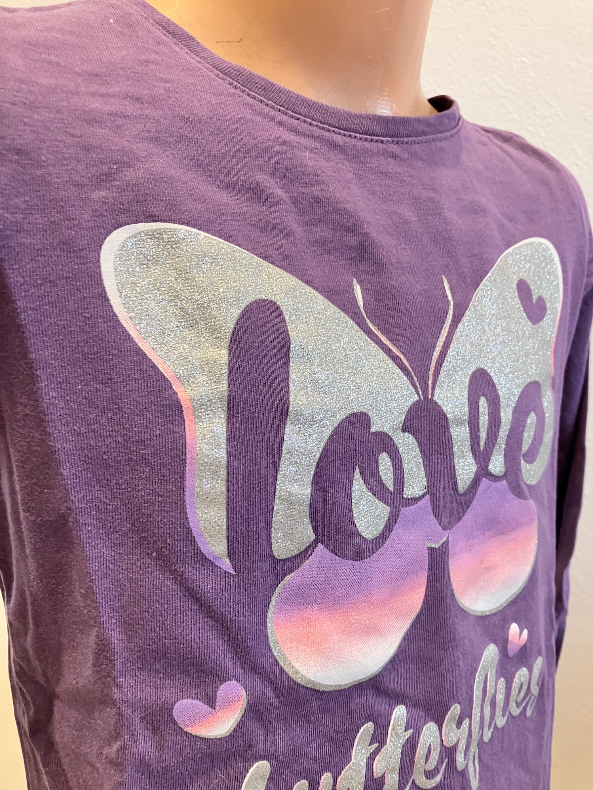 Dievčenské tričko s dlhým rukávom, potlačou motýľa a nápismi, strieborná časť je lesklá. Okrúhly výstrih, jemne elastické, materiál 100%bavlna.