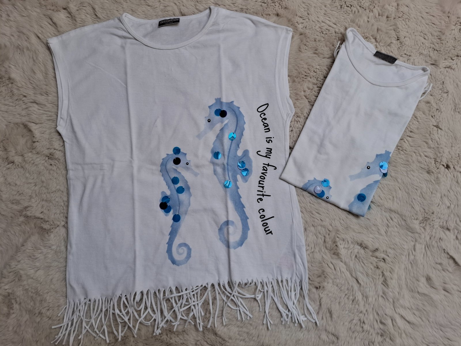 Nosené tričká, zn. Pepco, veľkosť uvádzaná 158/164, ale nosili ich pri veľkosti 152, na jednom zo zadnej strany slabý fliacik, neskúšala som už odstrániť. Cena spolu 4 Eur