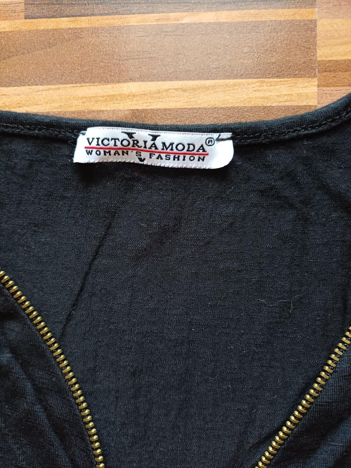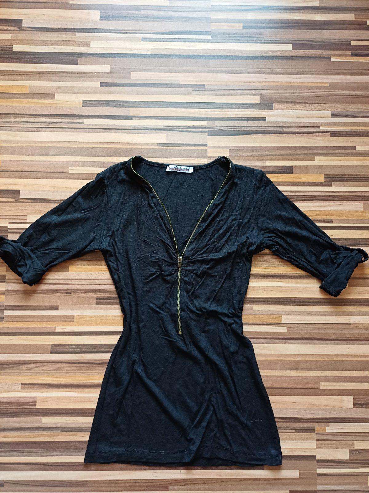 Tričko zn. Victoria Moda, veľ. sedí na S/M. Vo výstrihu zips - nastaviteľný, roll-up rukávy. Rozmery: dĺžka od ramena po spodný okraj 60 cm, šírka cez prsia 33 cm.