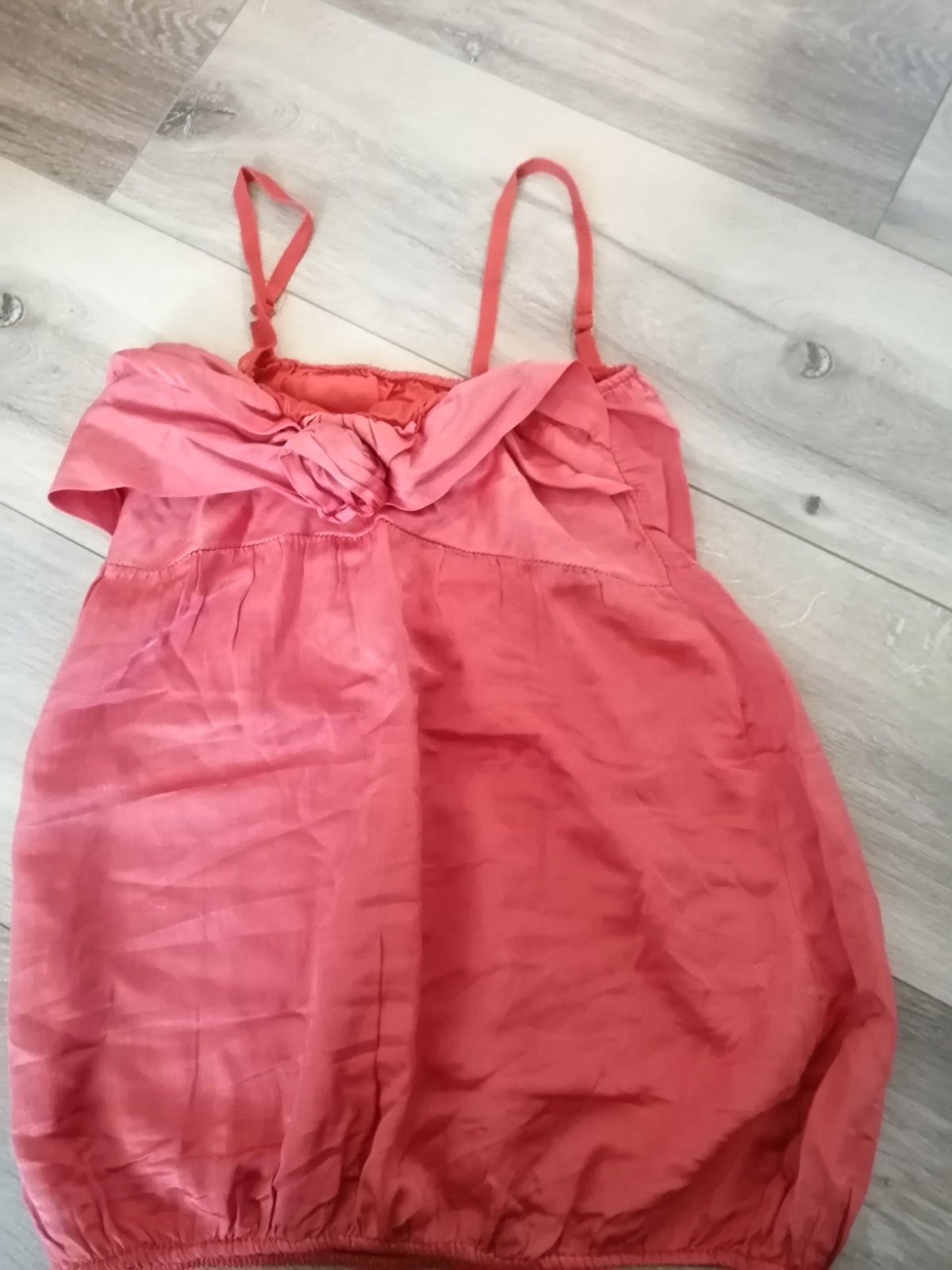 Asi 1x oblečený pekný nazberkaný top v top stave, veľkosť M/L. Farba je v skutočnosti taka tmavšia lososová, prípadne marhuľová. 95% bavlna, 5% lycra. V páse na gumičku. Dĺžka cca 51 cm, cez prsia...