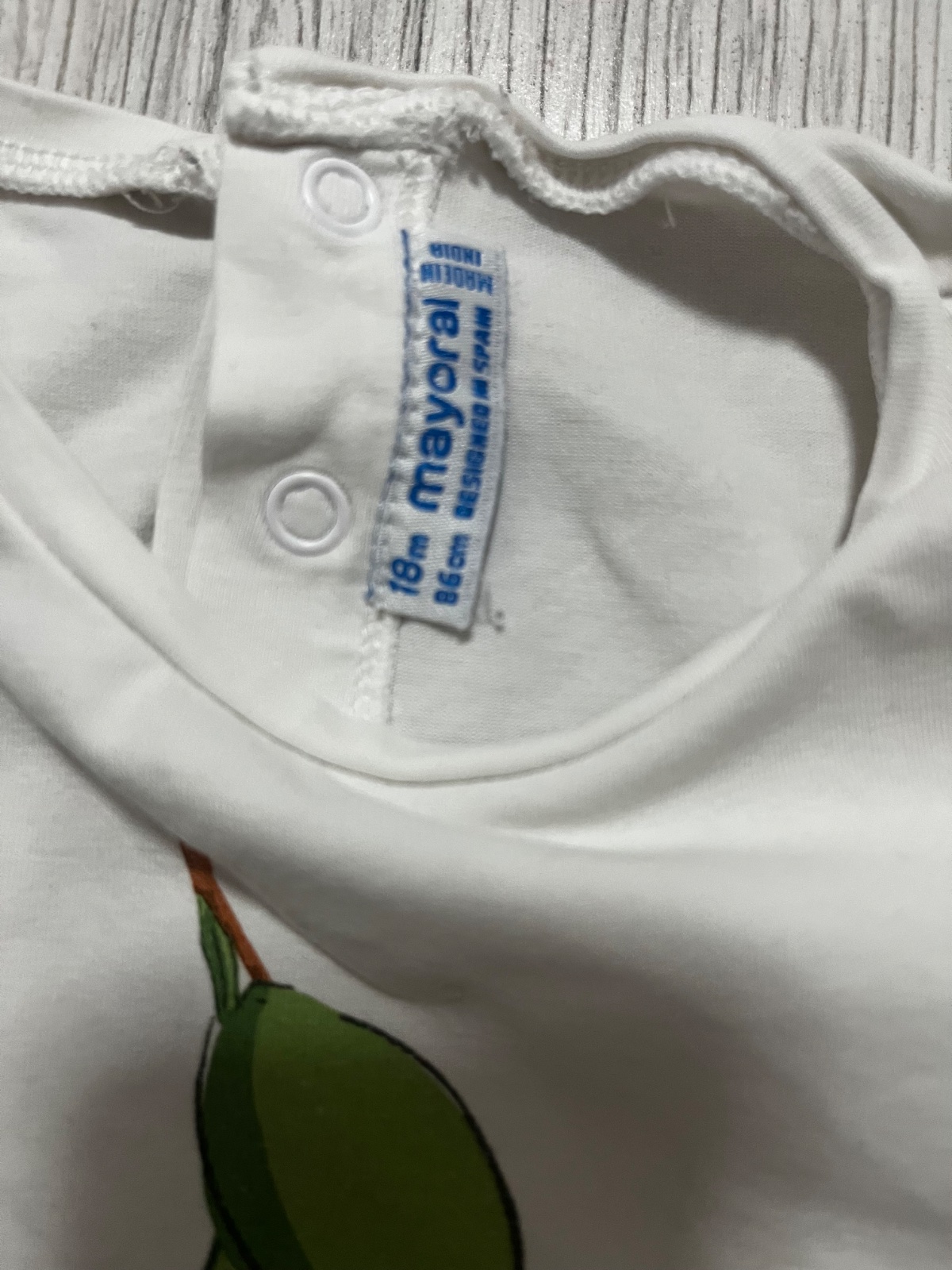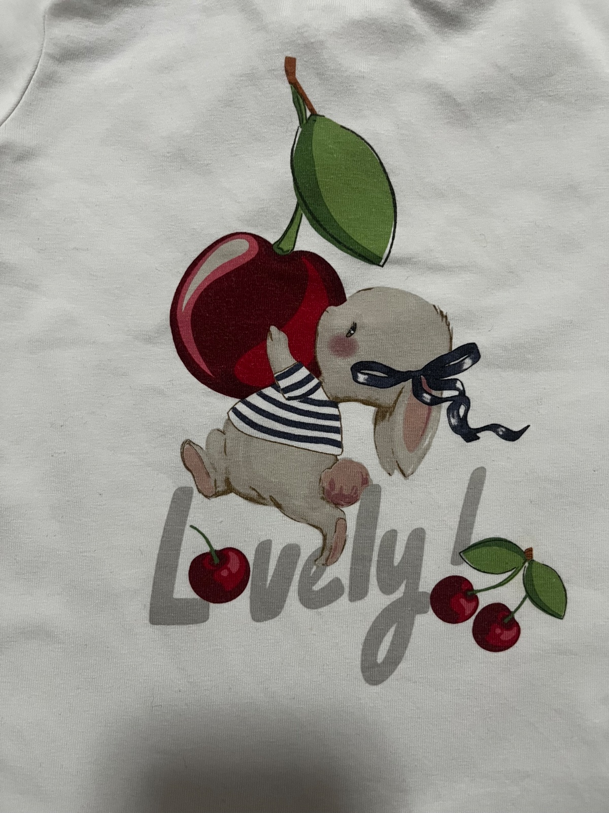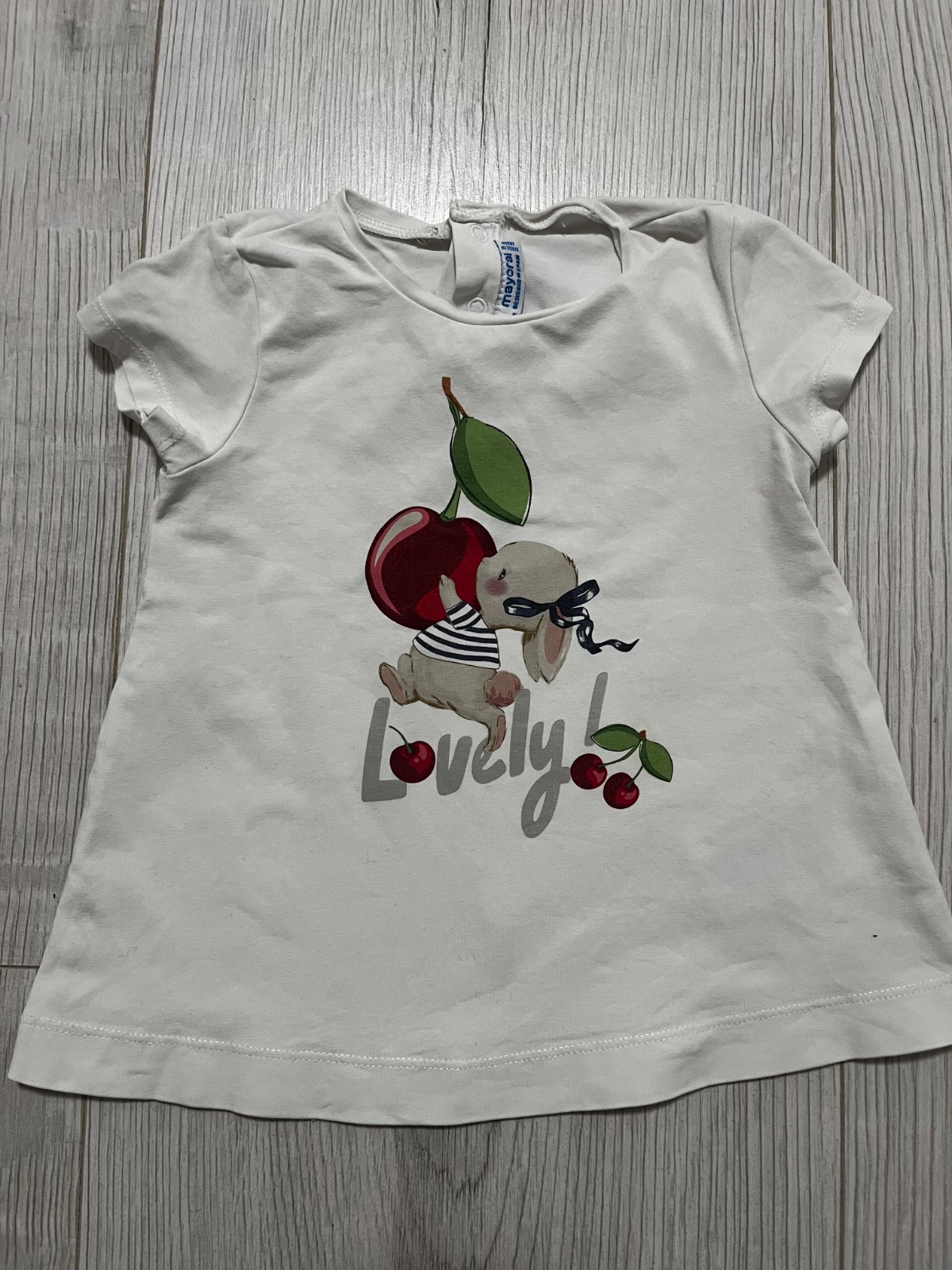 Predám biele krátkorukávové tričko s obrazkom zajka a čerešničiek. Značka: Mayoral, veľkosť: 86 (12-18 mesiacov).