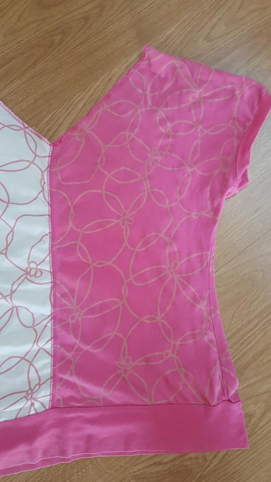 Žiadne známky nosenia, bez žmolkov a pod., šírka spodného okraja trička je 47,5 cm x 2, natiahne sa do 55 x 2 cm. Materiál 95 % bavlna, 5 % elastan.