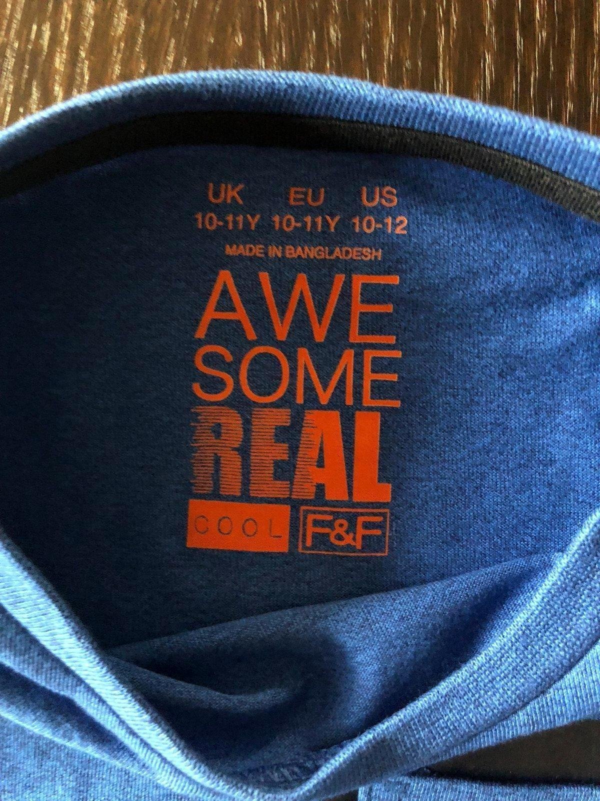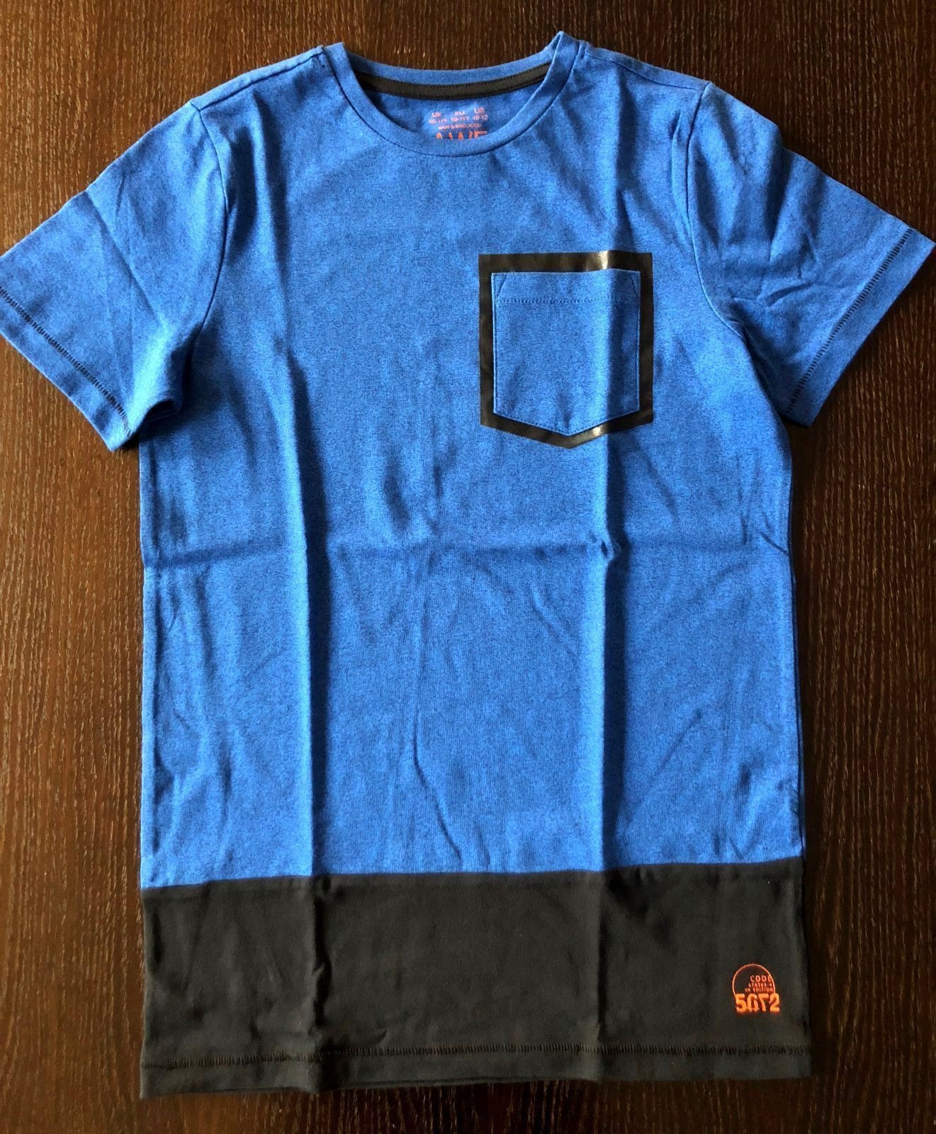 Chlapčenské modré tričko s vreckom vpredu. Značka F&F. Veľkosť 146 (na 10-11 rokov). Dĺžka 63 cm, šírka pod pazuchami 43 cm.