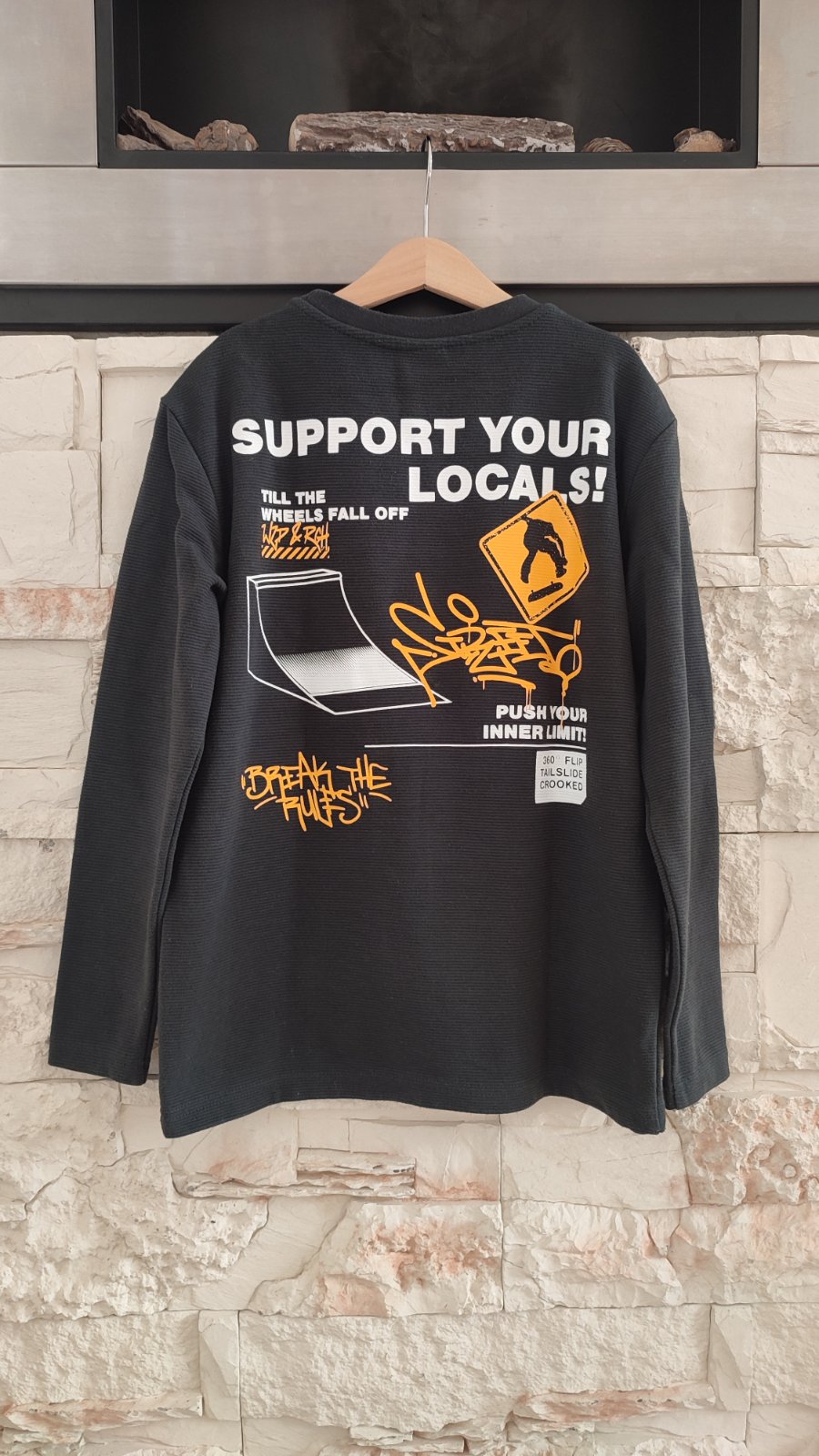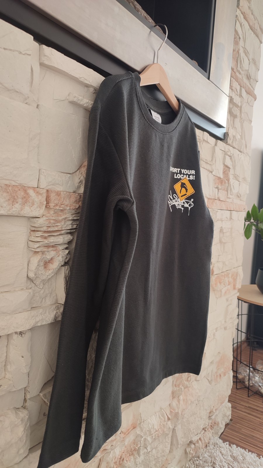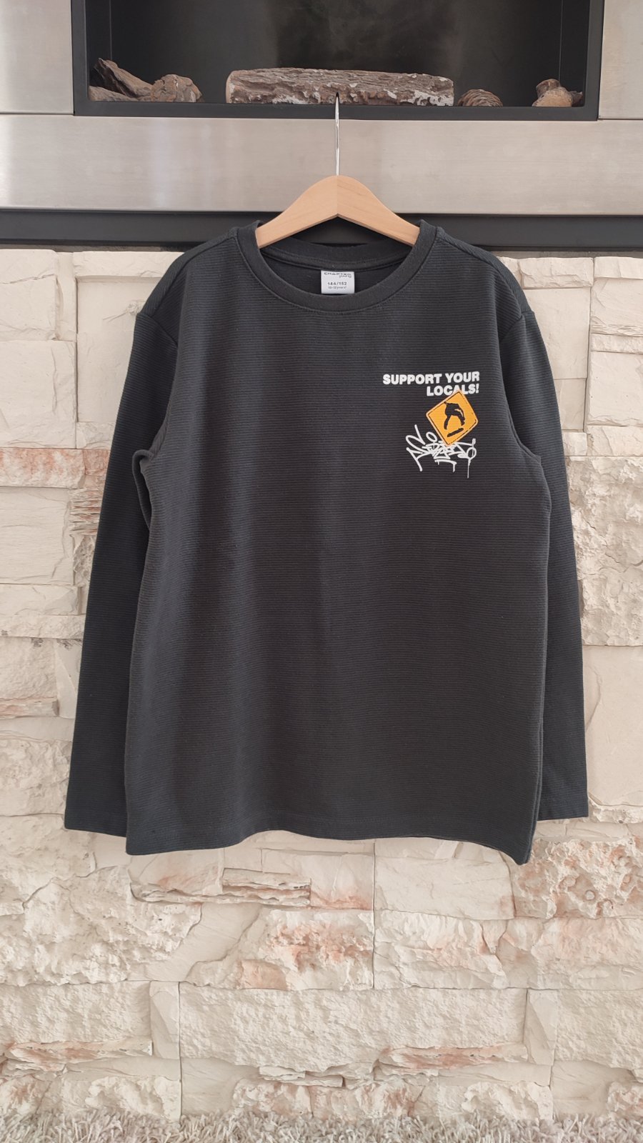 Ponúkam tmavosede tričko s potlačou na prednom aj zadnom diele . Je to hrubší, rebrovany materiál. Max 2 krát oblečené,rychlo sme vyrástli 😕.