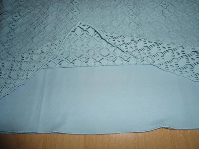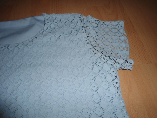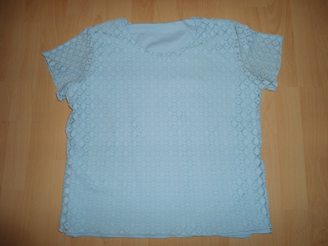 264d. bledomodre tričko, velk. L, dlzka 58cm, rukav 15cm, cez prsia 52x2cm, velkost je pisana XL ale je to skor L, treba premerat, vrchna vrstva ako čipka