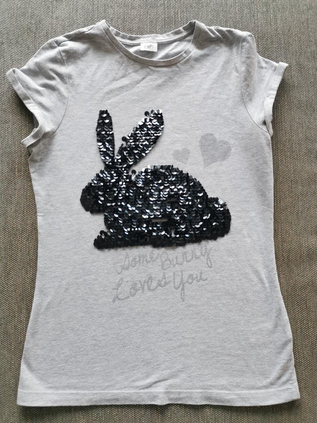 Krásna aplikácia zajaca z litrov, tričko má minižmolky ináč je ok. Dĺžka je 63cm, hrudník 2x43cm.