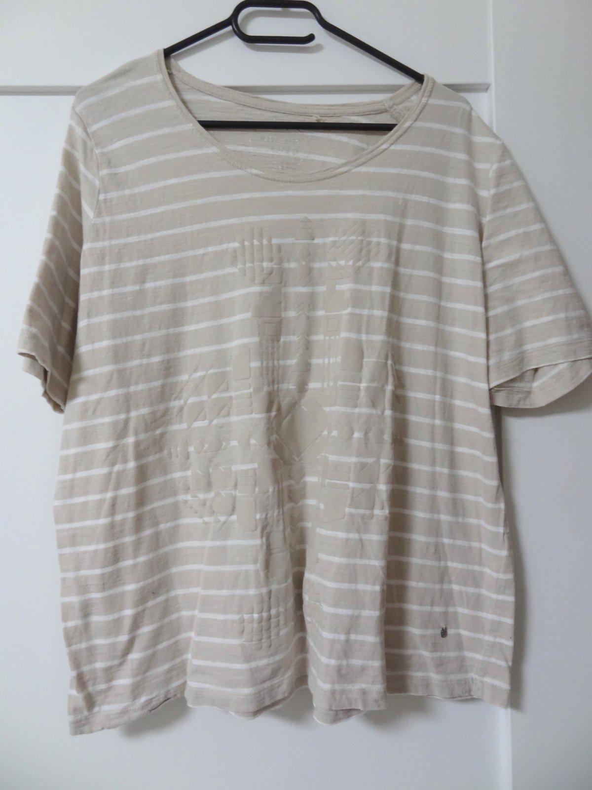 Dámske pásikavé tričko s potlačou ...svetlohnedé... dobrý stav ... veľ. 48 ... dlžka 65 cm, šírka pod pazuchami 58 cm, šírka pás 55 cm