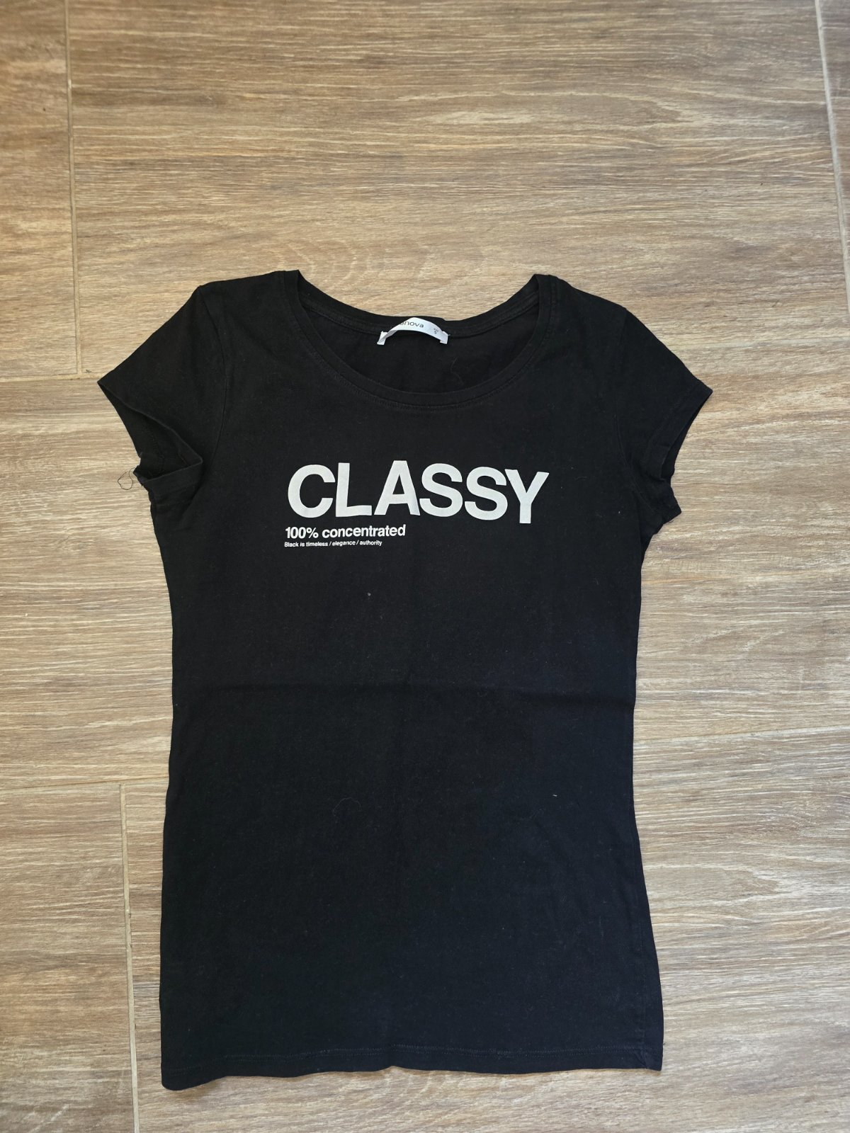 Predám nové nikdy nenosené veľmi pekné čierne tričko so zlatou potlačou, veľ.S (obtihnuté M), cena 5€+poštovné