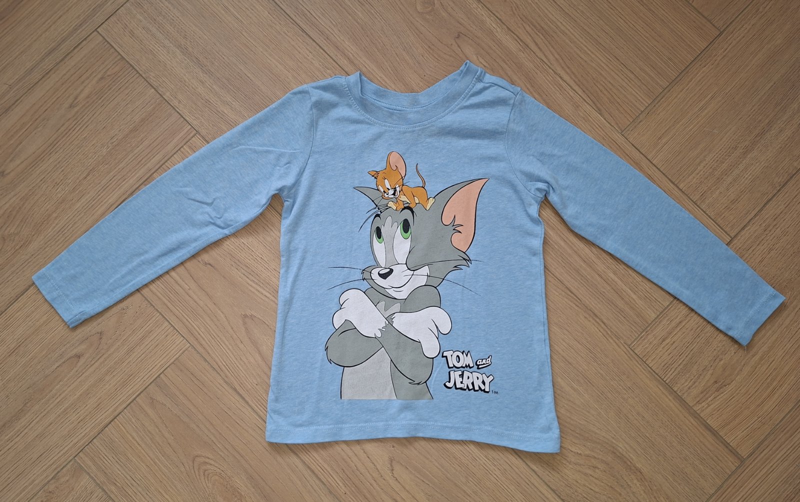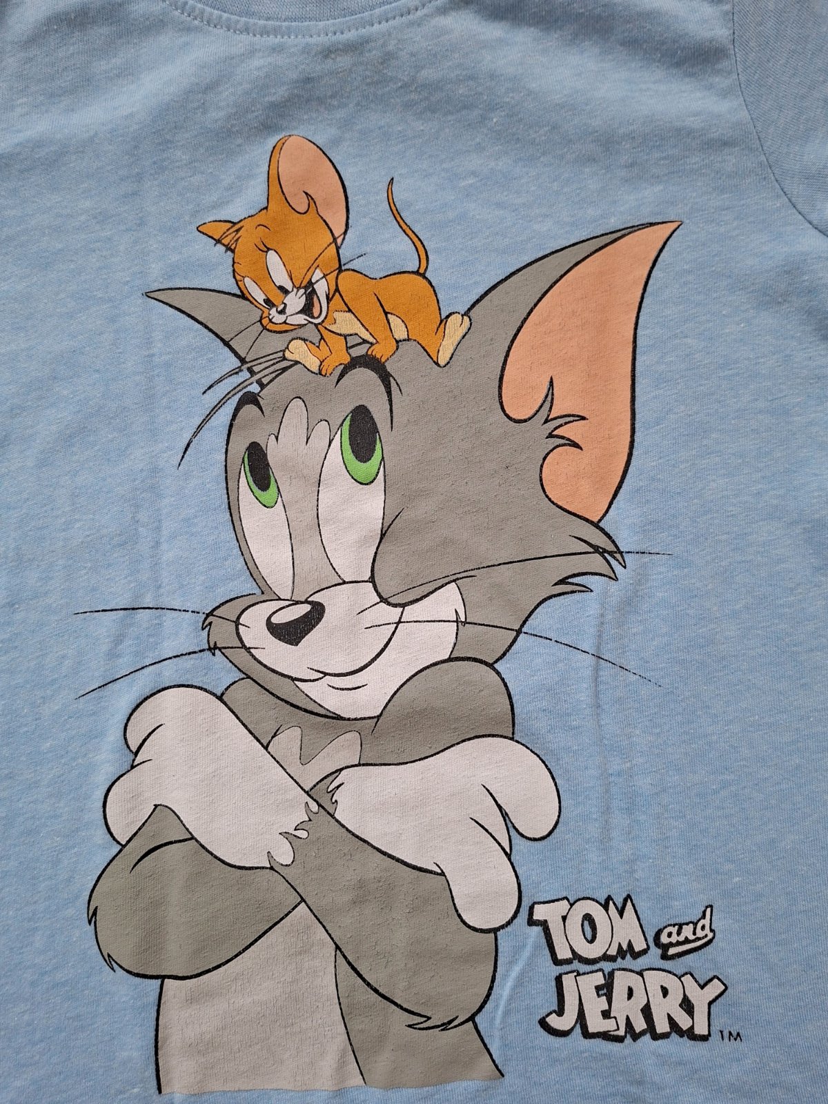 Bavlnené chlapčenské tričko s motívom Toma a Jerryho v dobrom nosenom stave (bez dierok, fliačikov a žmolkov; obrázok je viditeľne spratý (detail viď foto č.2)). Značka: Takko (odstrihnutý vnútorný štítok); veľkosť: 104 (3 - 4 roky) - synček ho bez problémov vynosil až do svojich 5 rokov.