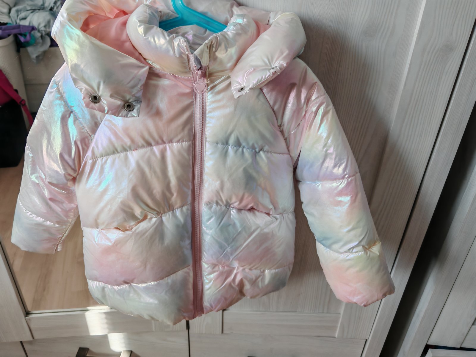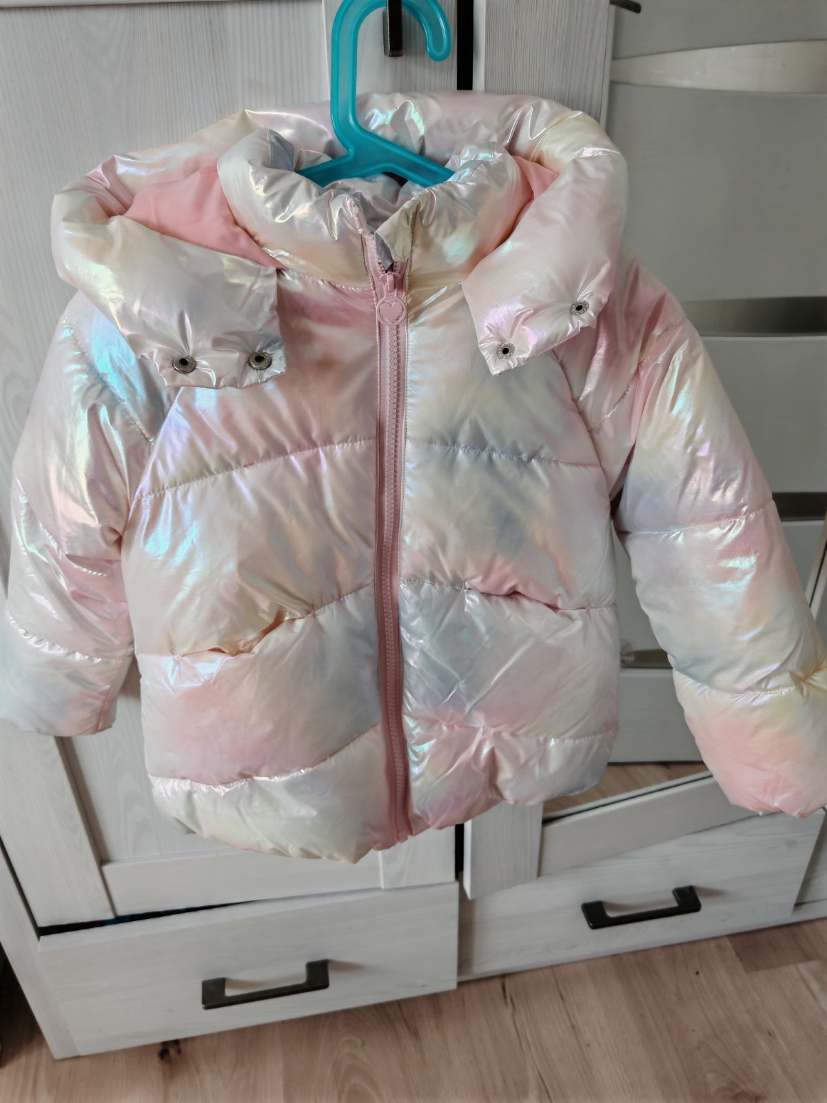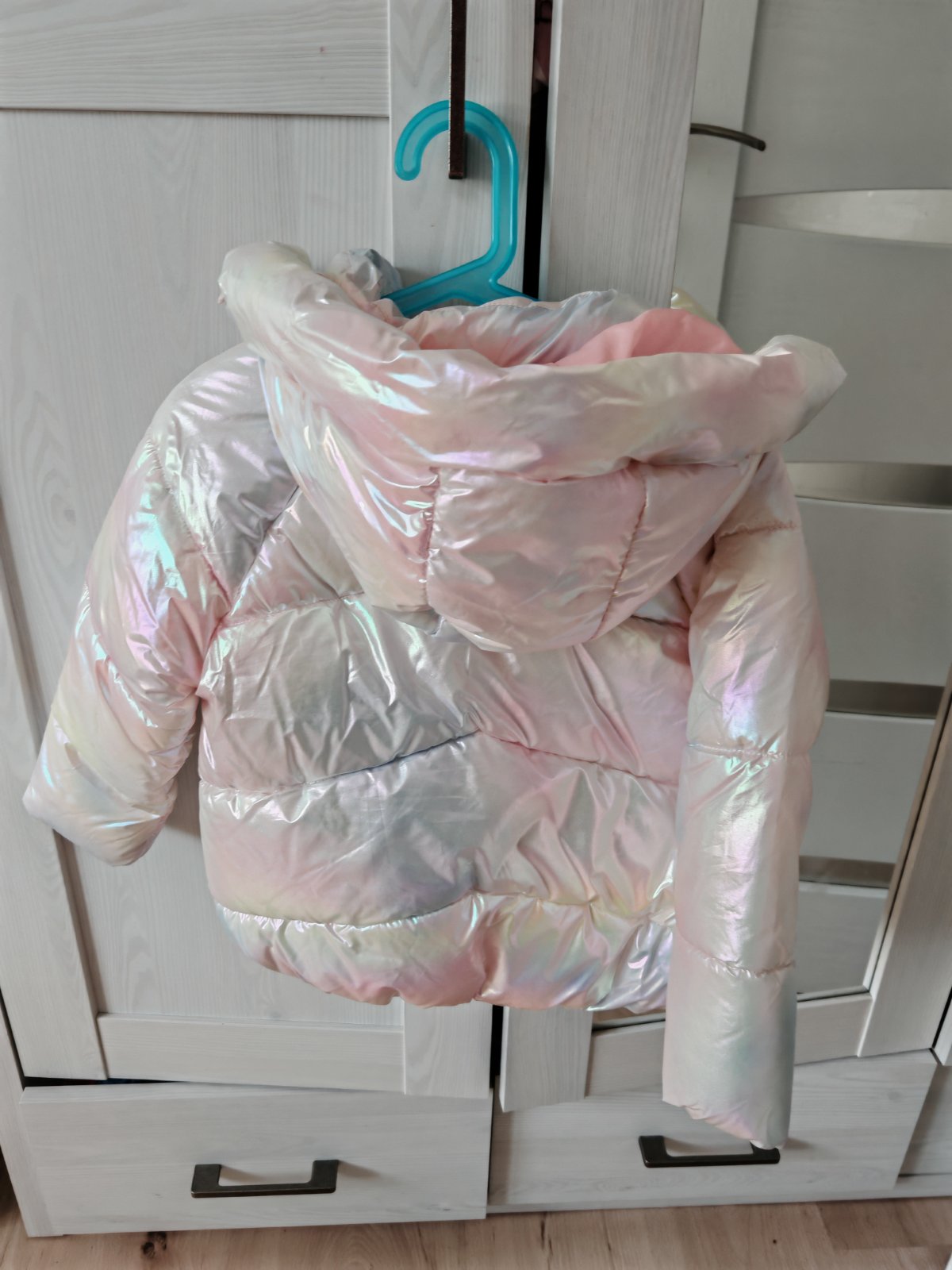 Nadherna bunda 1 x oblevena nadherna a mojej bola kratka, dcera nosila skor obycajne bundy, bolo mi lutodat jej ju do skolky cize je top ako z obchodu nadherna neolutujete. Je biela s menivym odleskom, krasna.Ale sadne aj na 110 aj 116