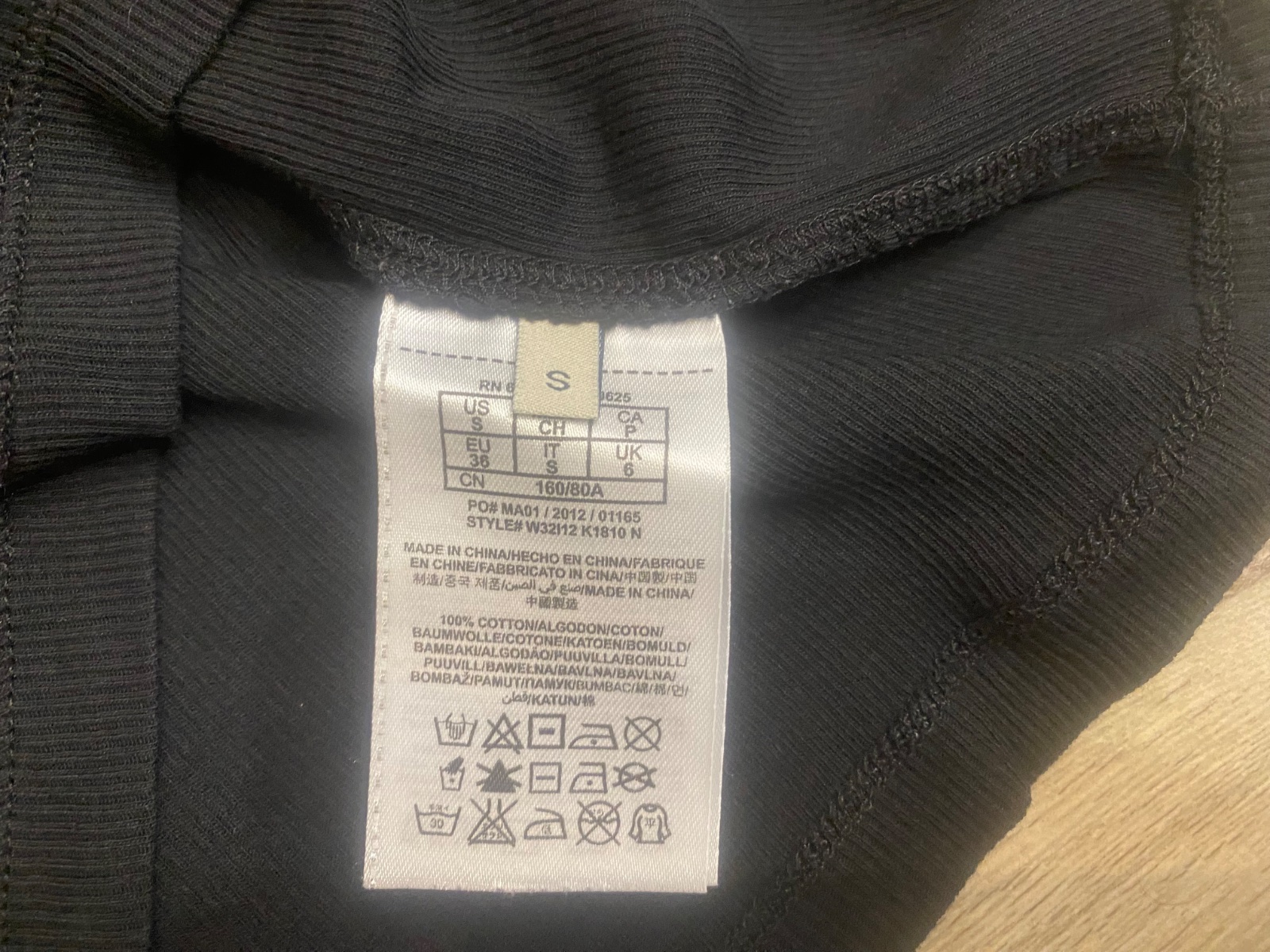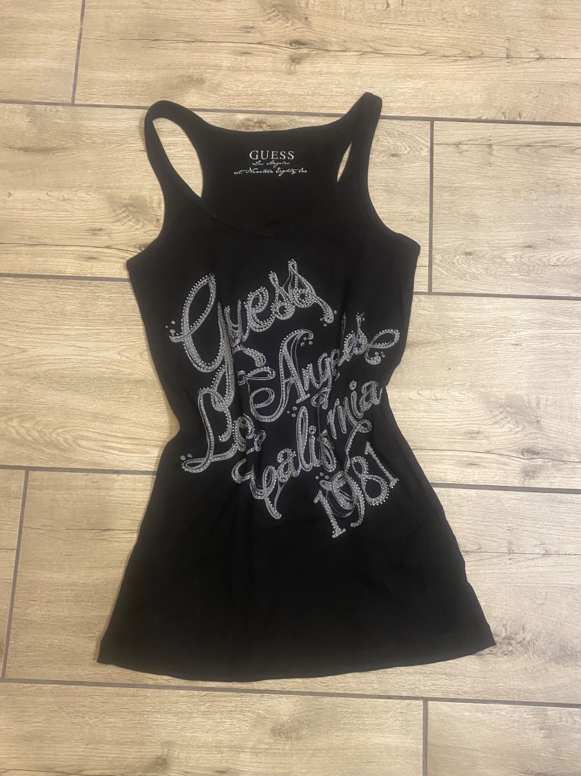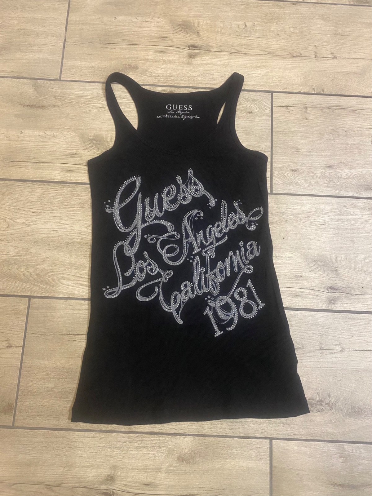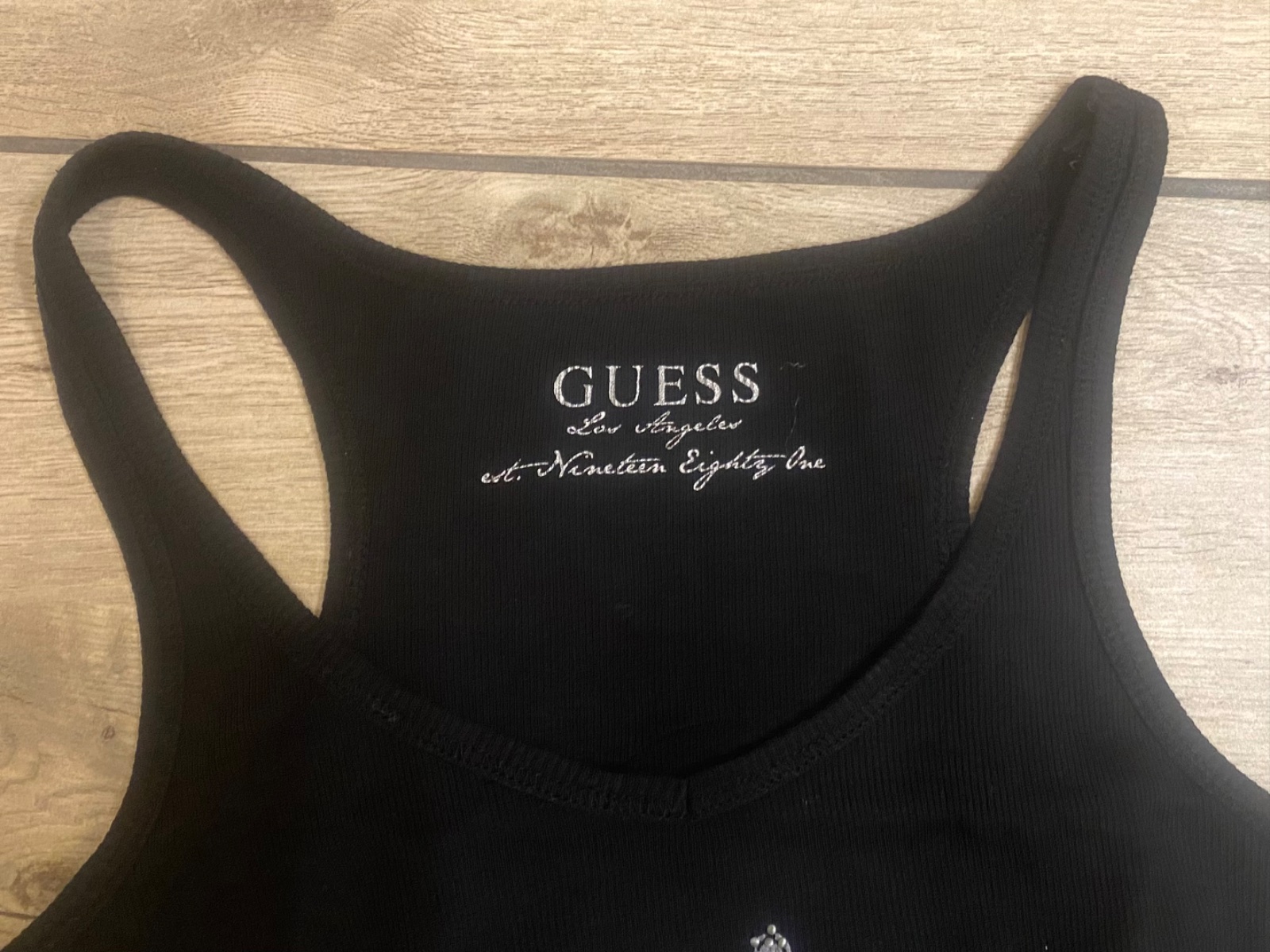 Dámsky čierny top zn GUESS veľ S, má podšitú podprsenku, strih voľný padavý, ukončený patentom. Materiál bavlna s elastanom. Oblečený 2x.