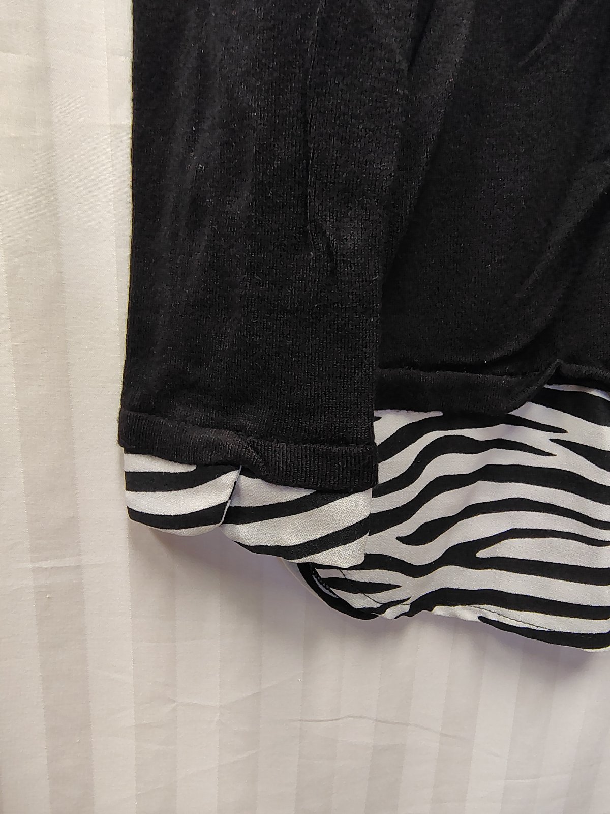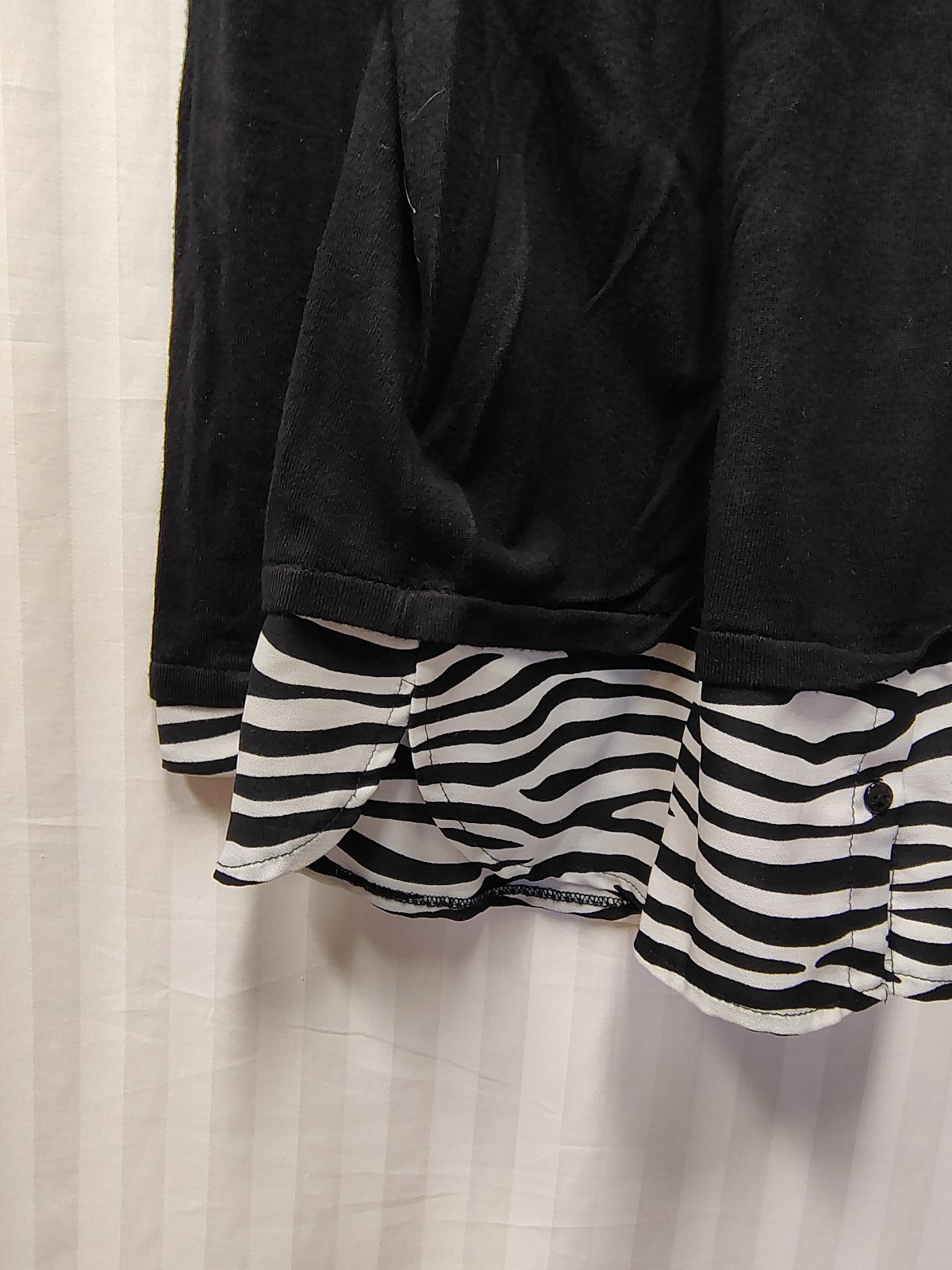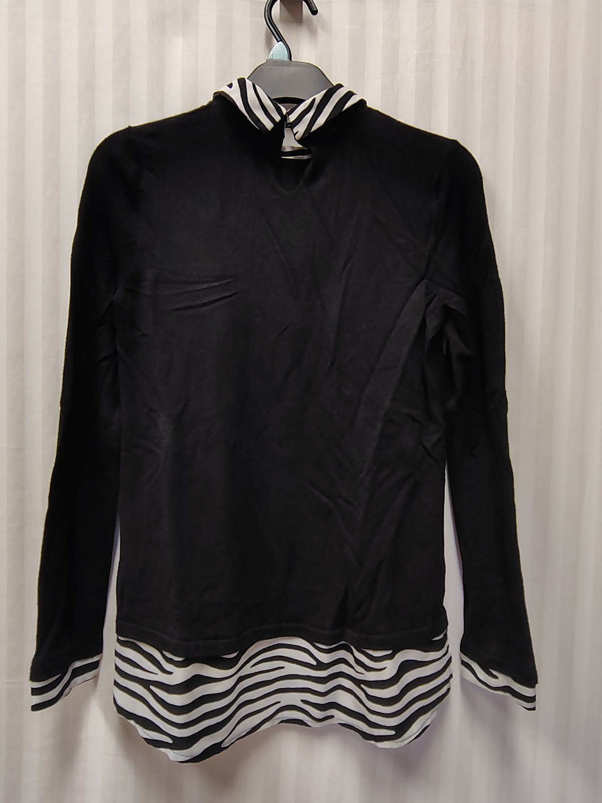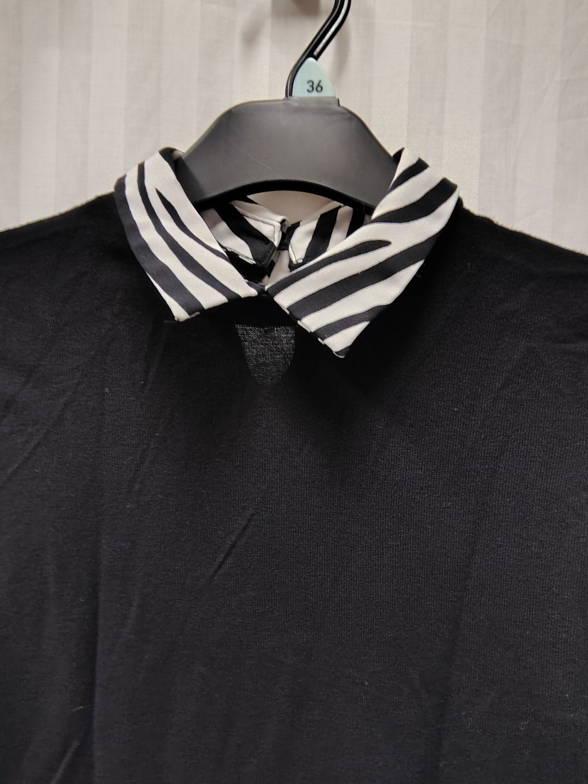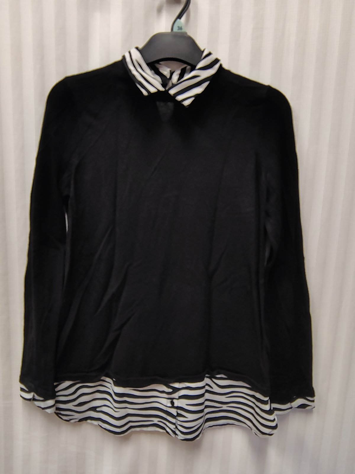 dámsky elegantný pulóvrikový top v čiernej farbe s módnym efektom 2 v 1, má integrovaný (všitý) golier a spodný lem s čierno-bielym zebrovaným vzorom, čo pôsobí, akoby ste mali pod svetrom oblečenú košeľu, vzadu hore zapínanie na gombík